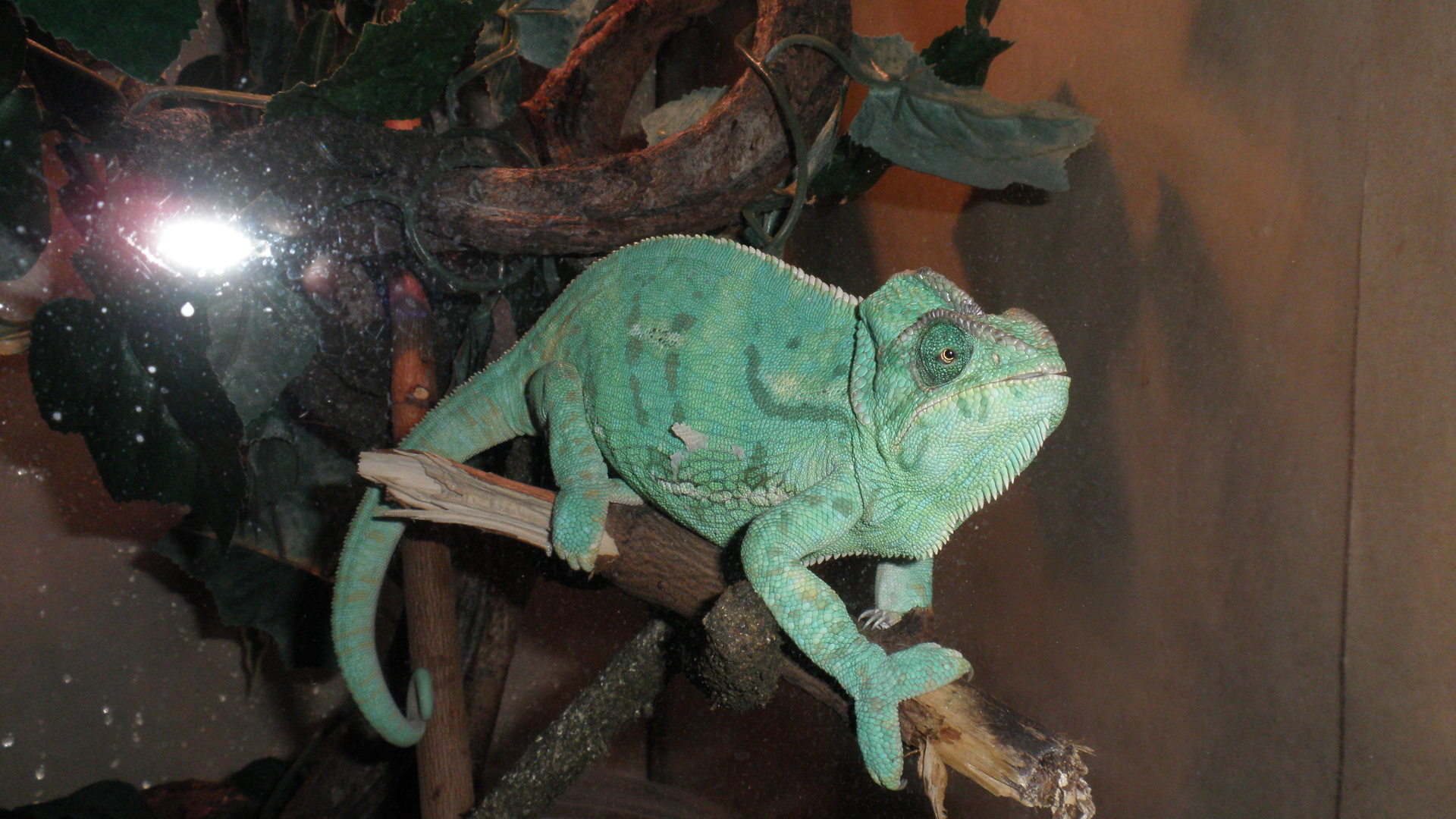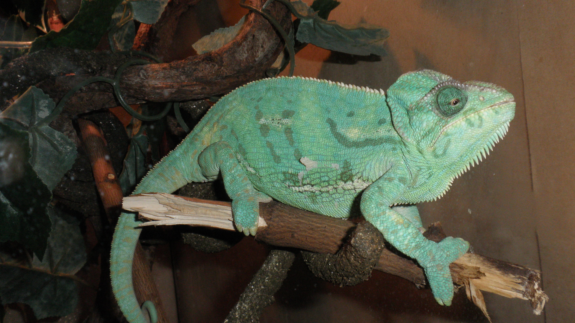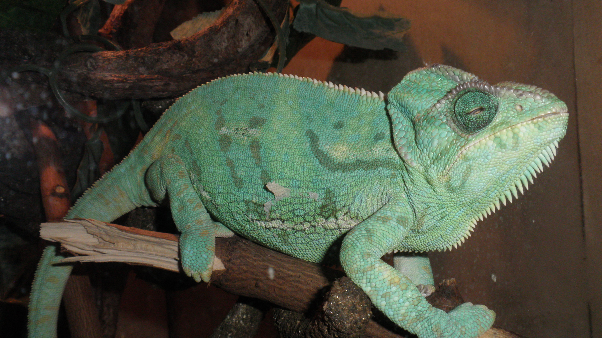 2) Doporučuji odlišné vyvětvení, tenčí, všelijak kroucené větve, hustá spleť. Chameleonům to rozhodně víc vyhovuje. Některé s nich (hlavně pod zdroji světla a tepla) samozřejmě v horizontální poloze pro pohodlné sezení.