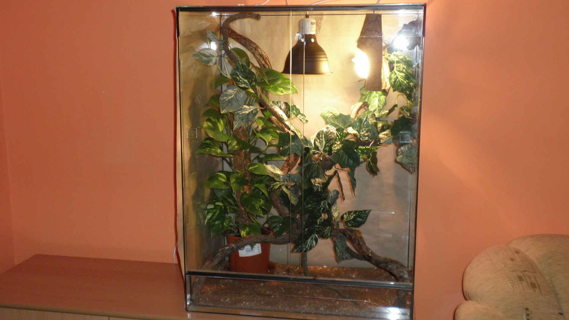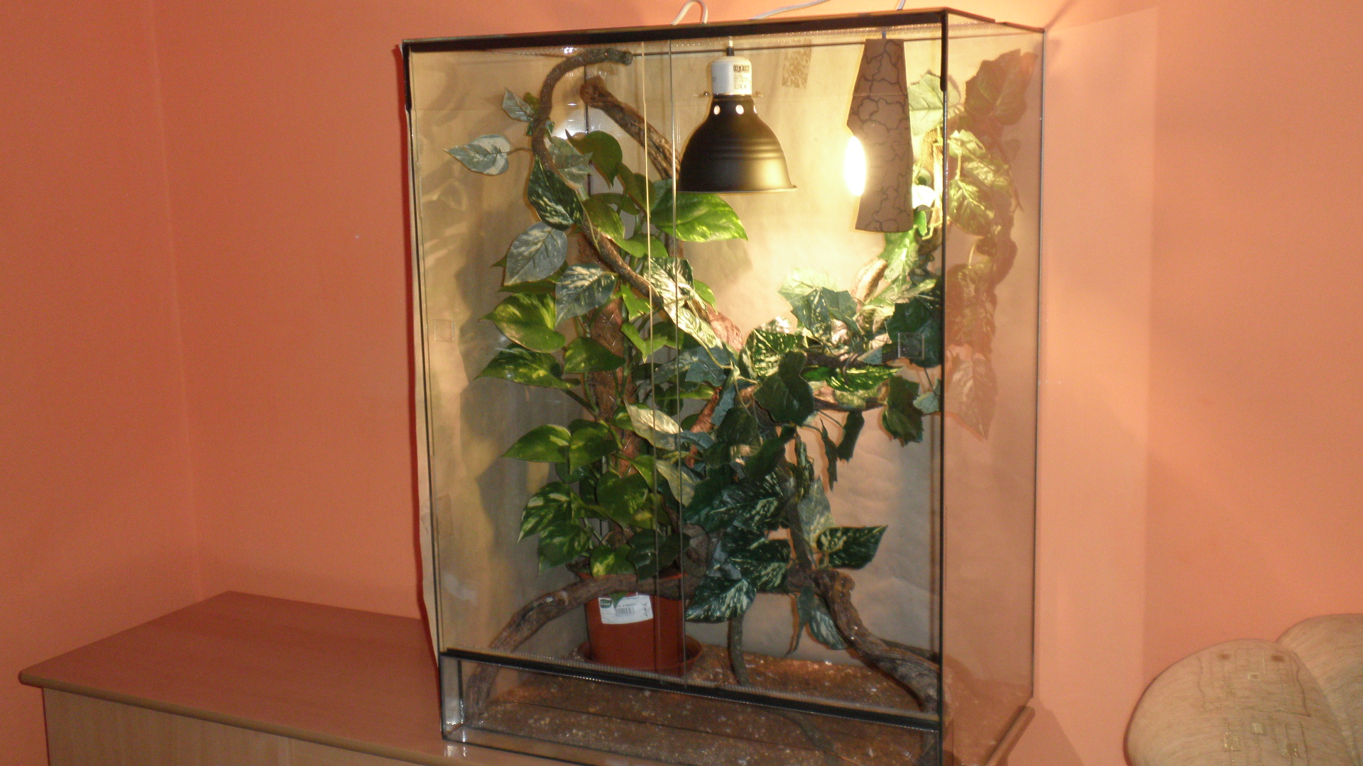 Ahojky po špatné zkušenosti chci vědět jestli toto předělané tarárko je vyhovující pro chameleona velikost 80x60x40, zářivky jsou Repti glo 5.0 UVB, výhřevná Sun glo 50w Halogen, živá kytka Potos, liány a umělé květiny. Taploměr zatím nemám (starý vyhozen). Druhý dotaz jestli tyto vatamíny jsou dostačující a jak často podávat. Zde jsou fotky terárka díky za rady