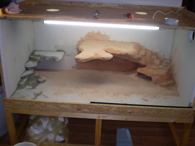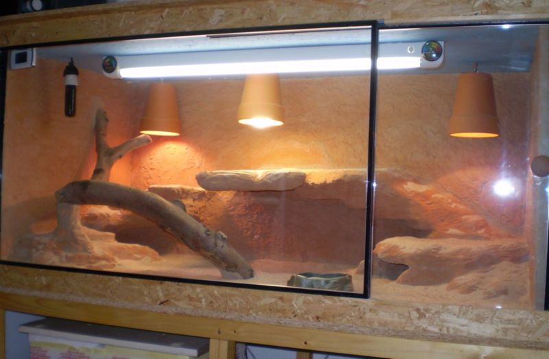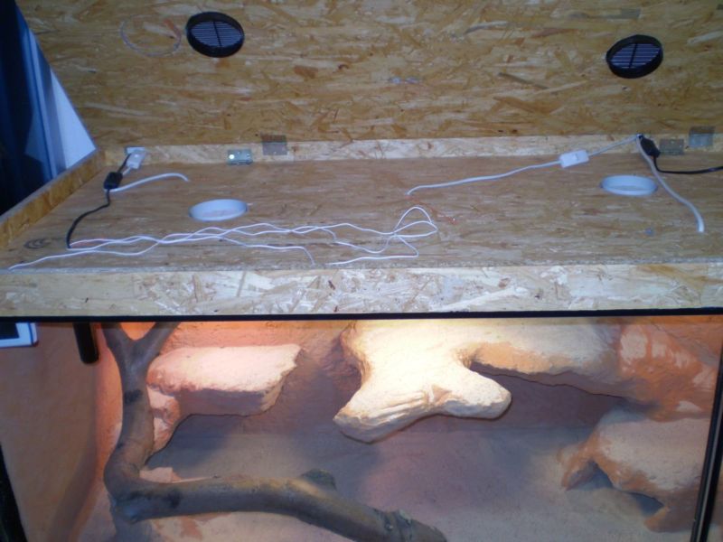 Taky nevím jestli větrání bude dostatečný ?Sou tam dva horní a jeden boční o průměru 10cm.Myslím,že asi budu muset dokoupit termostat,protože bydlím ve starším domě a k ránu klesá teplota pod 20 C.To čelní sklo je dvojté,takže skvělá izolace tepla.Chtěl sem mít velký nerozdělený prostor na koukání,ale při čištění terária nedosáhnu na druhý konec.Ale na to se dá využít horní dvojtý strop,kde je i schované el.kabely.
