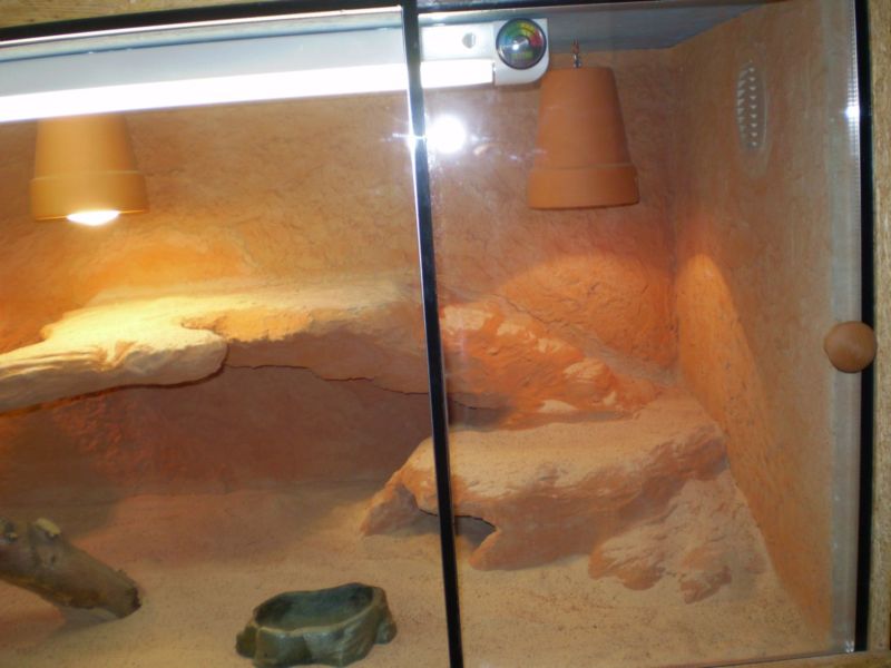 Terárium máte dost vysoké - nebylo by lepší dát tam jednu výbojku místo tří žárovek? A místo toho Repti Gla dát obyč lineárku na osvětlení (ono to repti glo moc nesvítí) a do těch ostatních objímek třeba úsporky na dosvětlení, případně ještě jednu silnější žárovku?