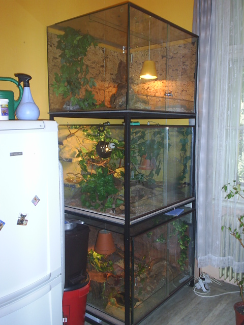 Nevidím najmenší problém v tom, aby to boli tri suché terárka nad sebou a boli celosklenené. Bežne sa to robí, sám mám doma celosklenené samonosné akvaterárka postavené na sebe. V každom je približne 250 litrov vody plus zo 25 litrov piesku a bez problémov držia. Keby to nebolo vysoké, v pohode by to unieslo aj tretie poschodie