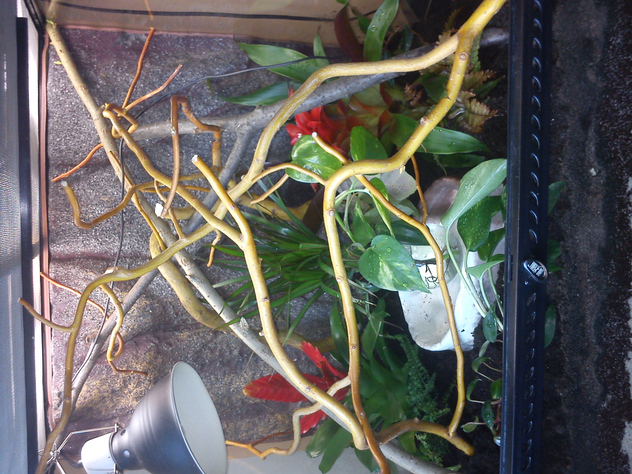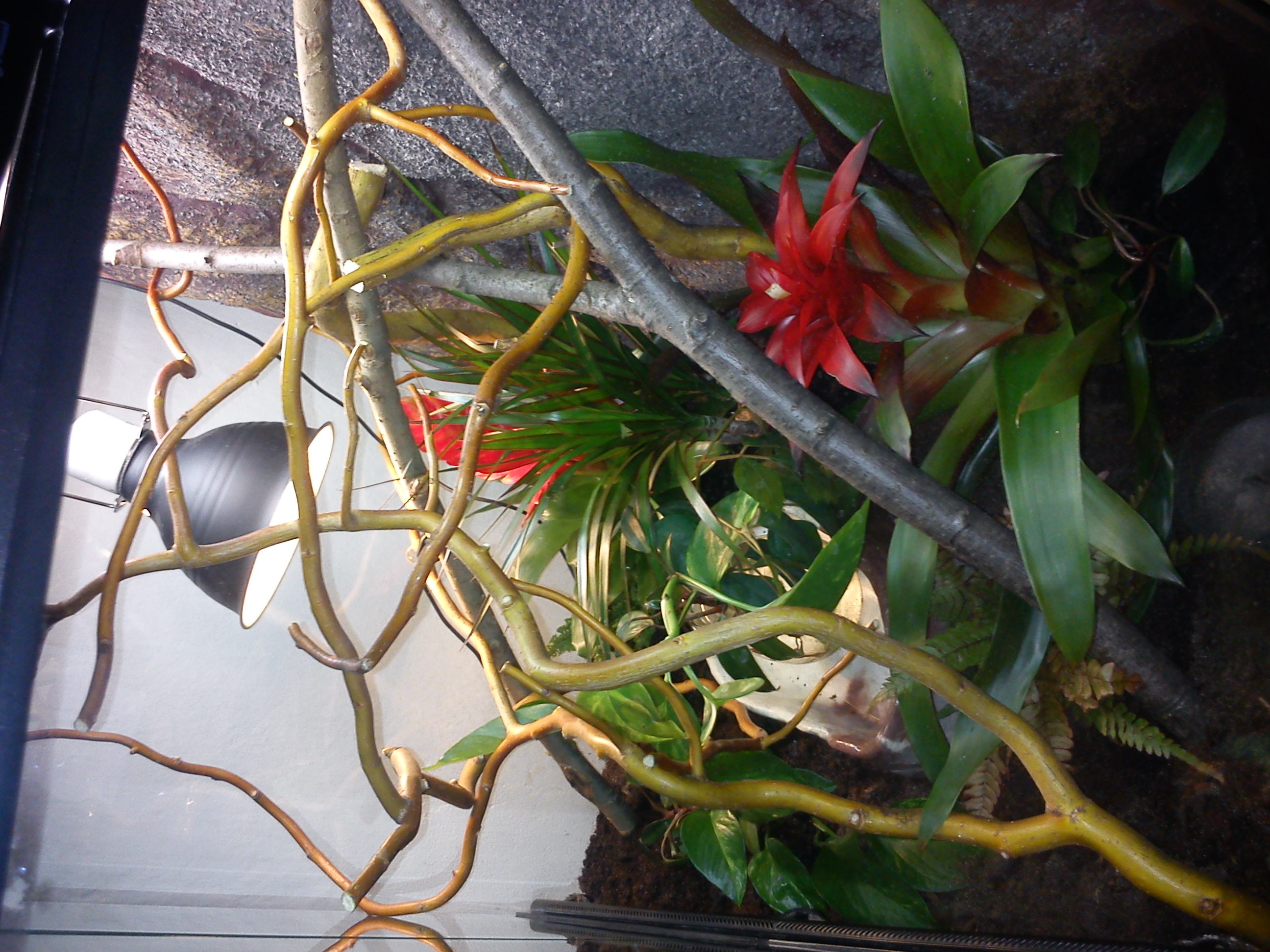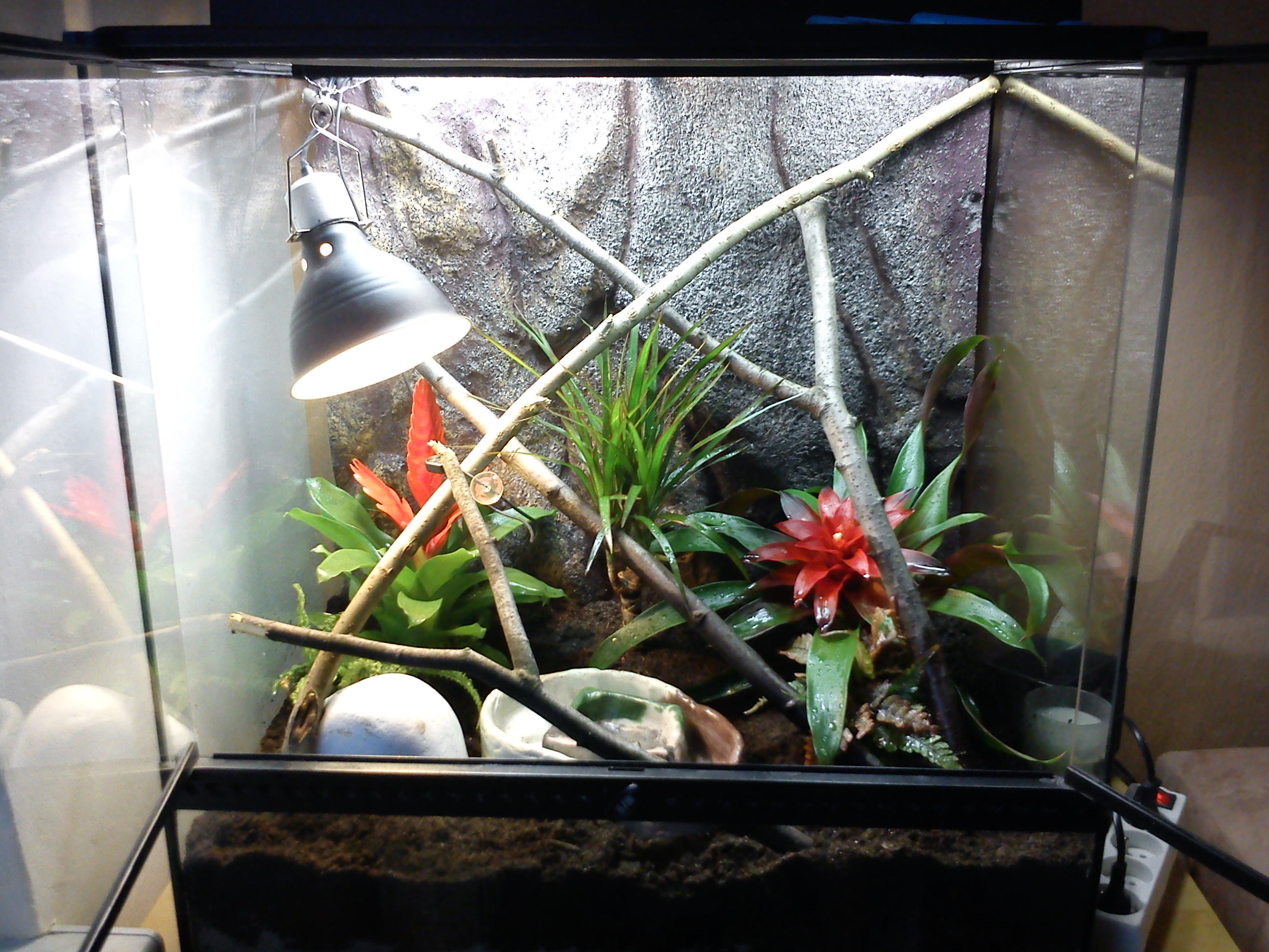 Tak za mě je to terárko dost hrozný. Nemá to dole vůbec žádné větrání, tak tam bude dost hnusnej vzduch. Vybavení taky nic moc - bude i tmavé, když je tam jen žárovka, chtělo by to ještě dosvětlovat. Ale není tam pozadí ani víc větví, tak můžou využívat jen tu část s rostlinama...sice lezou i po skle, ale když není nic kolem, nebudou se cítit zrovna nejlíp a ani nemají moc příležitost vlézt si blízko k žárovce a nahřát se...