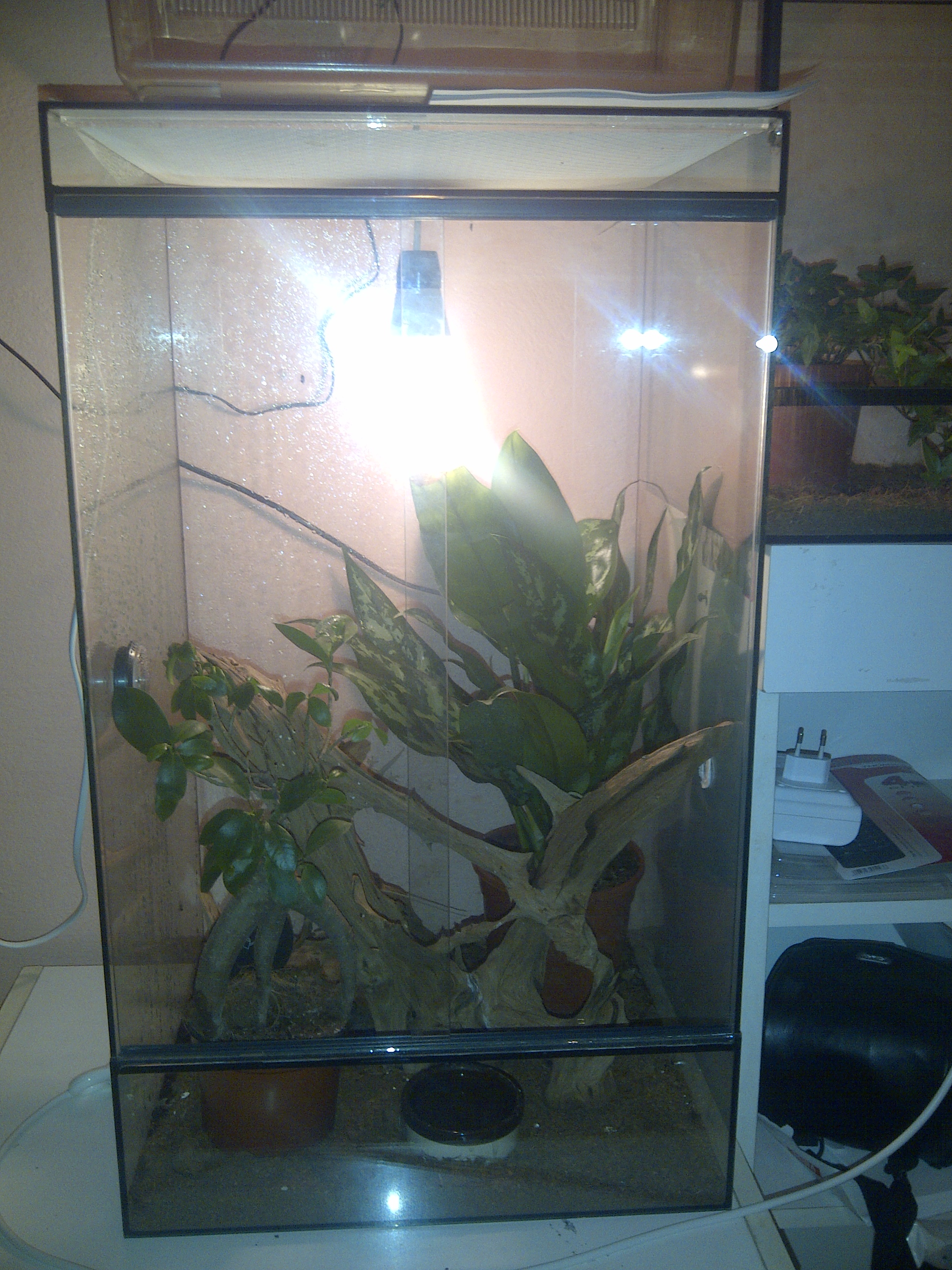 Tak za mě je to terárko dost hrozný. Nemá to dole vůbec žádné větrání, tak tam bude dost hnusnej vzduch. Vybavení taky nic moc - bude i tmavé, když je tam jen žárovka, chtělo by to ještě dosvětlovat. Ale není tam pozadí ani víc větví, tak můžou využívat jen tu část s rostlinama...sice lezou i po skle, ale když není nic kolem, nebudou se cítit zrovna nejlíp a ani nemají moc příležitost vlézt si blízko k žárovce a nahřát se... Je to teda jen můj estetickej dojem no...Každopádně to větrání je nutný udělat i pod dvířky...