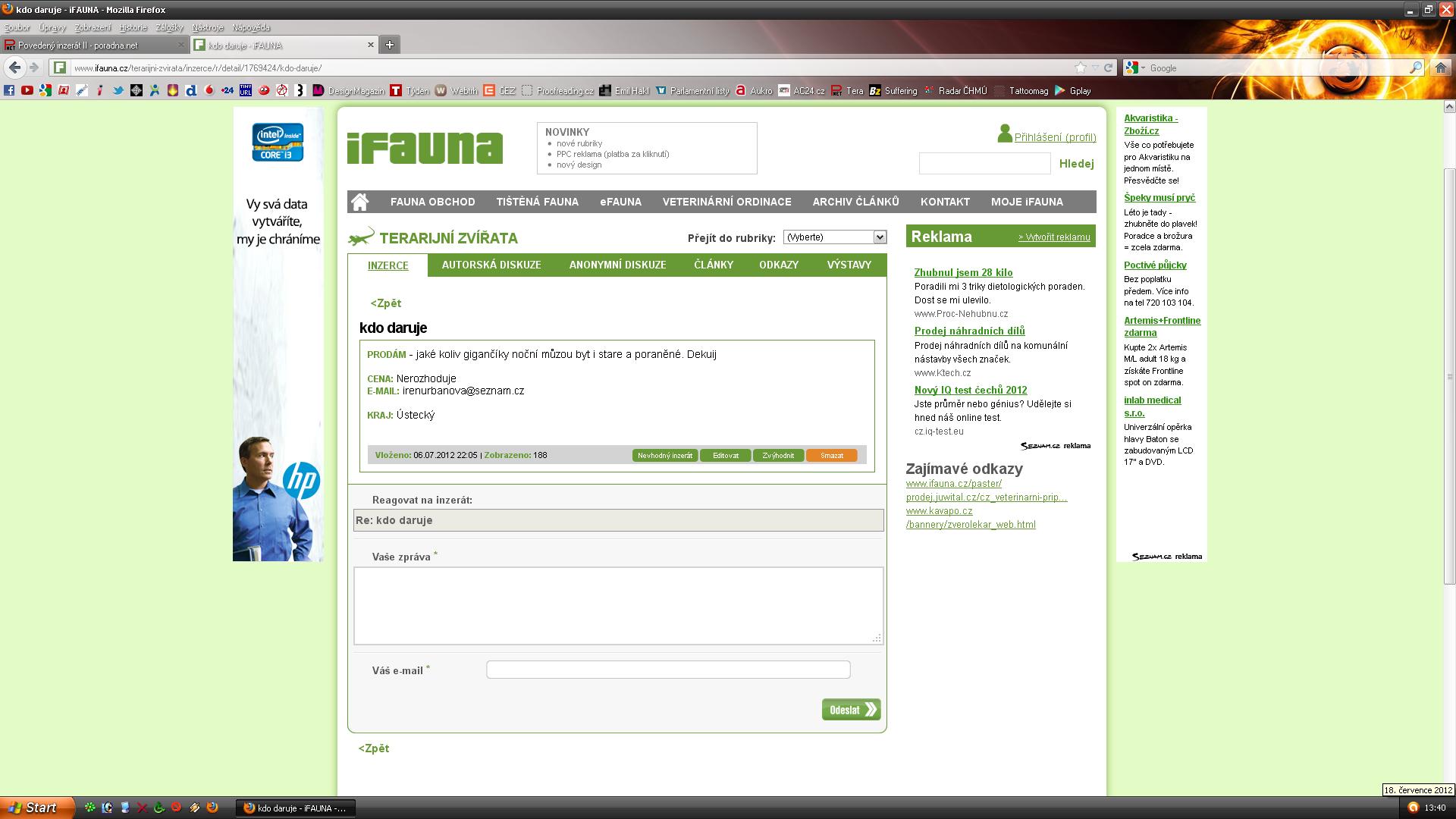Taky nikde nevidim, ze bych nekoho z inzerentu pomlouval, ci zesmesnoval - nemyslel jsem tím vás že pomlouváte ale že tato diskuze k tomu vede ve stylu co napsala mmajuska - Ono je dotyčnému co prodává jedno jestly zvíře chcípne nebo co s ním bude dál, jde mu o to aby za zvíře dostal alespoň nějakou kačku a to mu případné zkrmení druhému zvířeti neda nic. A taky samotné vložení do sem do Povedený inzerát II proto si myslím že takovéto inzeráty tu nepatří. Což je hlavní věc co tím směřuji je ta že by se tu takové inzeráty nemusely vkládat protože na nich není nic "povedeneho"
