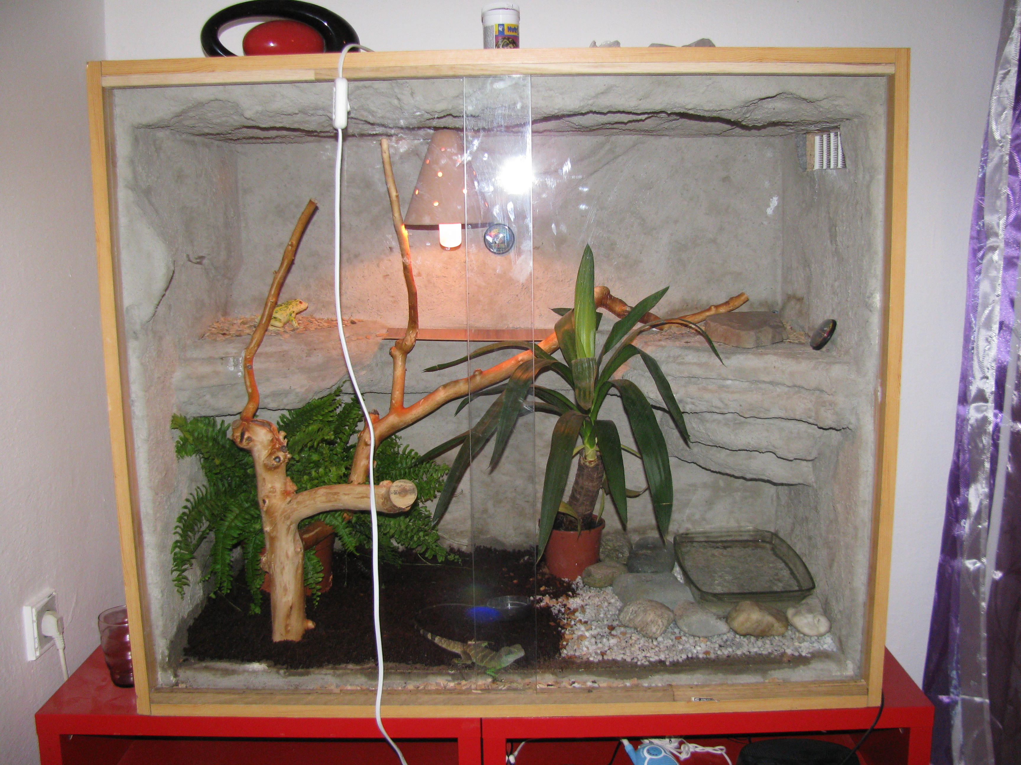 Přidal bych nějaký větve a kytky a trochu zvětšil nádrž s vodou. Ten květináč je s nějakou úsporkou, jestli dobře vidím? Pokud ano, tak asi bude agamě chybět výhřevný místo. A taky zdroj UVB... S tím světlem asi nejde hejbat, co? květináč se žárovkou by to chtělo posunout nad nějakou tu polici, třeba nad tu jak sedí ta umělá žába (nebo co to je)