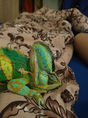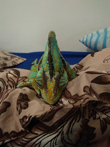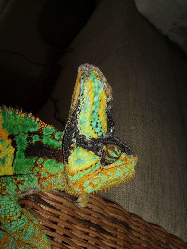 Tak...slíbil jsem, že budu průběžně informovat, protože lacerta se to snažila svést na ledviny, zánět, či ukládání neodbouraných látek. Chameleon má pořád nafouknutou helmu, pořád více pije, pořád se chová normálně, leze, má sílu, spokojené zbarvení, chuť se pářit atd. Stále je nafouknutá jen helma.