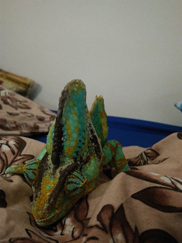 Takže, chameleon má stále nafouknutou přilbu, stále nadměrně pije a stále je vše ostatní v pořádku...má chuť, stisk, je aktivní, vylučuje v pořádku, Zvláštní, ale prostě je to tak. Teď už sem napíšu, jen pokud se něco změní.