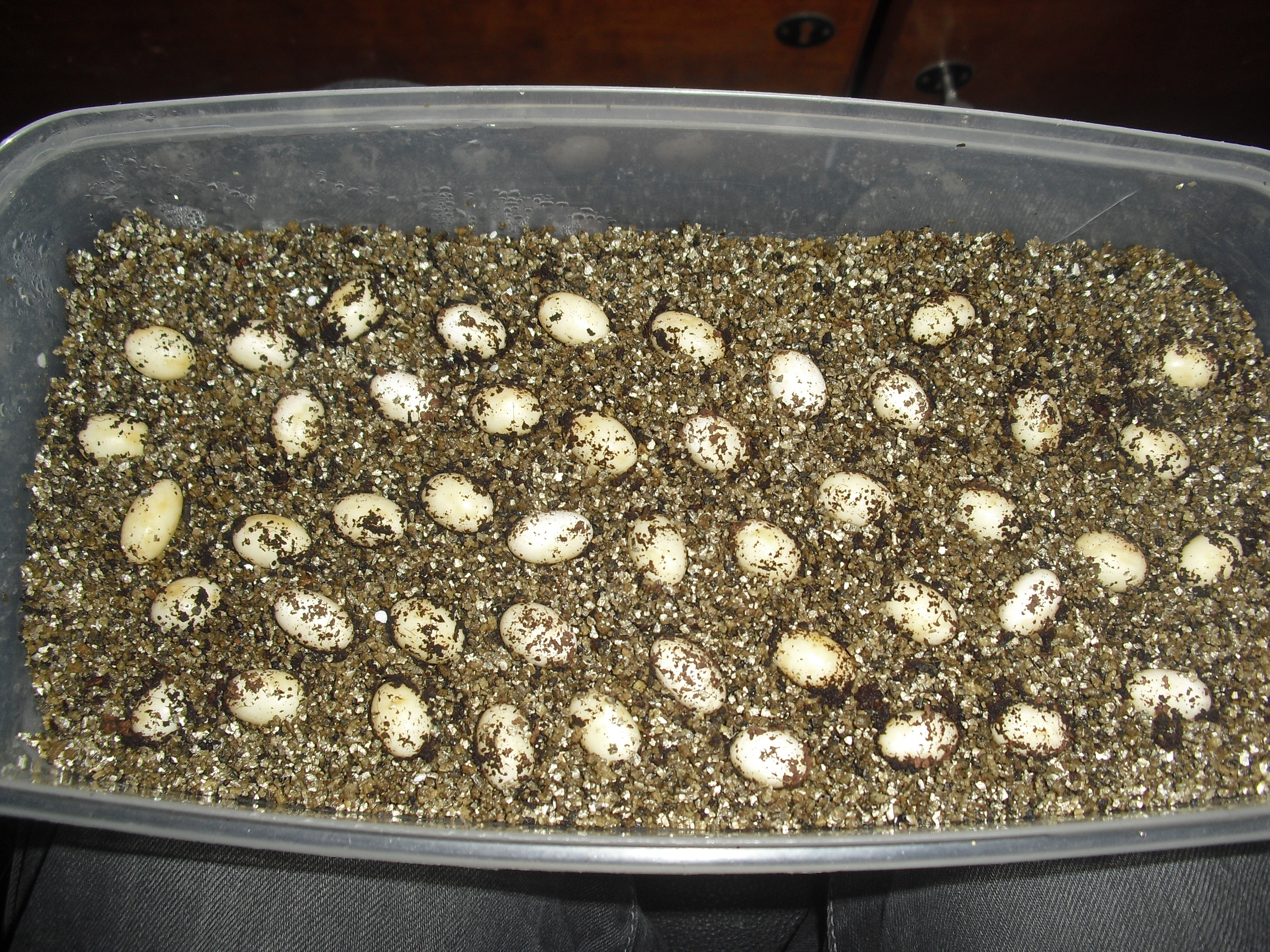 Zda je vermikulit dostatečně vlhký poznáte jedině odhadem. Já to dělám tak, že si vezmu trochu mezi prsty a zmáčknu, pokud nevyteče nic, je suchý a je třeba dovlhčit. Pokud vymáčknu trochu vody, je vše ok. Pokud při zmáčknutí voda až vykapává, je to zase moc a je třeba přidat trochu suchého vermikulitu. U jemeńáků se mi líhne druhá snůška, mám také vodní inkubátor, akorát topné těleso mám jen v lahvi od okurek a krabičky s vajíčky jsou položené vedle. Voda pak tolik nekondenzuje a vajíčka neplesniví. Inkubuji při 25-27 stupních, mláďata se začala líhnout po cca 220 dnech a lezou pěkně jedno po druhém, doslova řada po řadě, krabička po krabičce :)