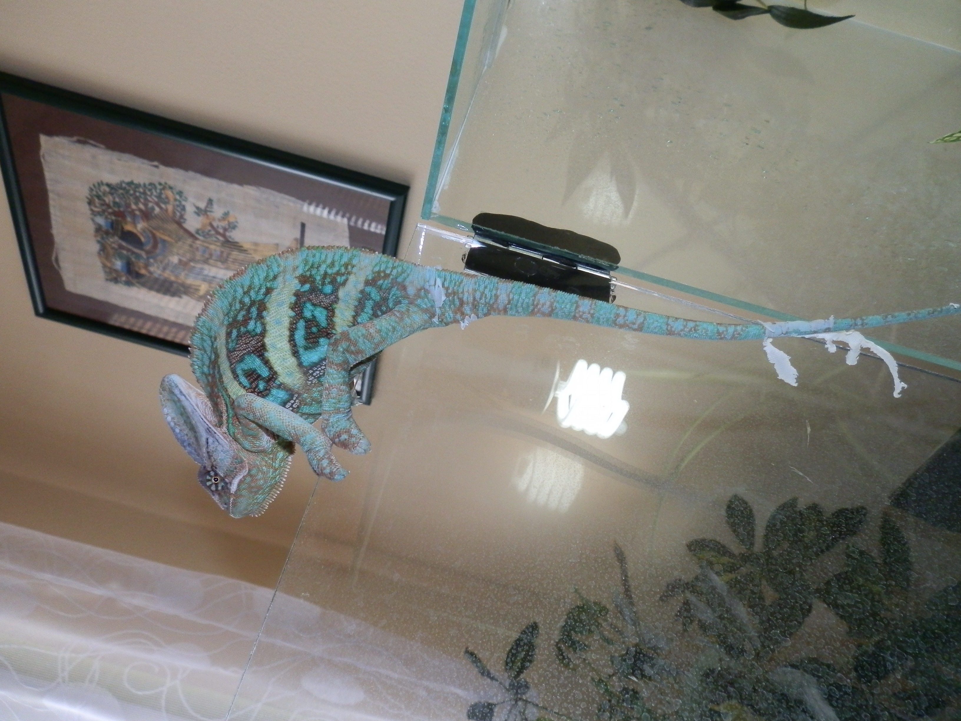 Vitamínů a rosení je moc....větrání by si taky zasloužil mnohem lepší....UVB je na hovno a to terárium je strašně malý....