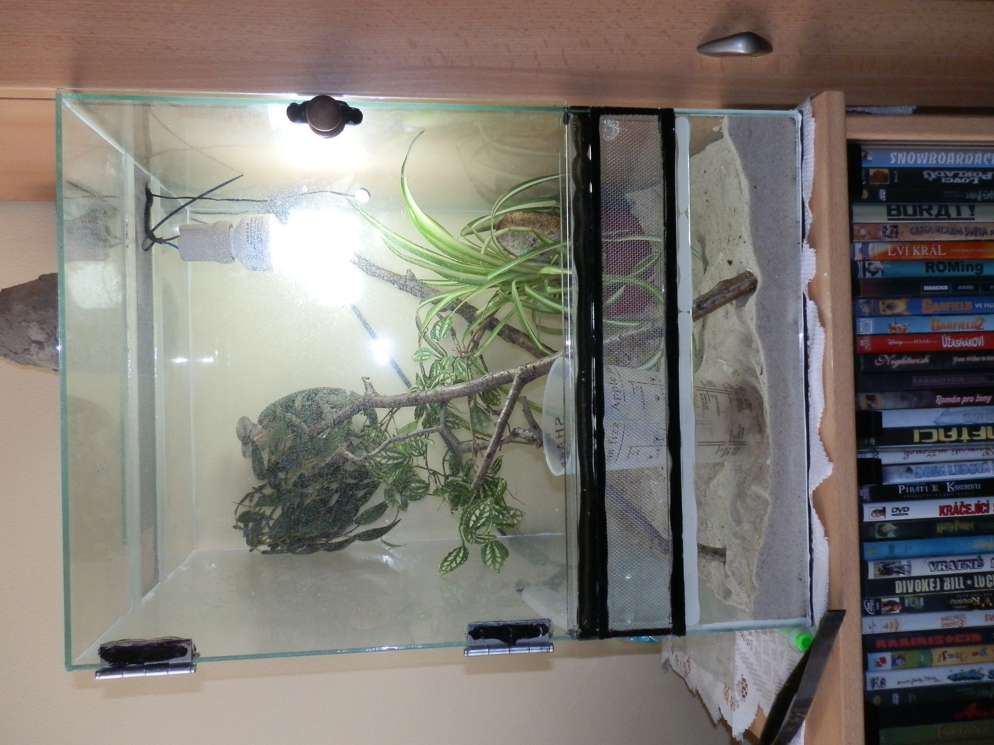 Fotky chamíka a terárka jsou z dneška. Omlouvám se, ale chamík je před kydáním, proto tak má jen pár košťátek a jednu žárovku. Až bude vykydaný přidám vám nové fotky ;)