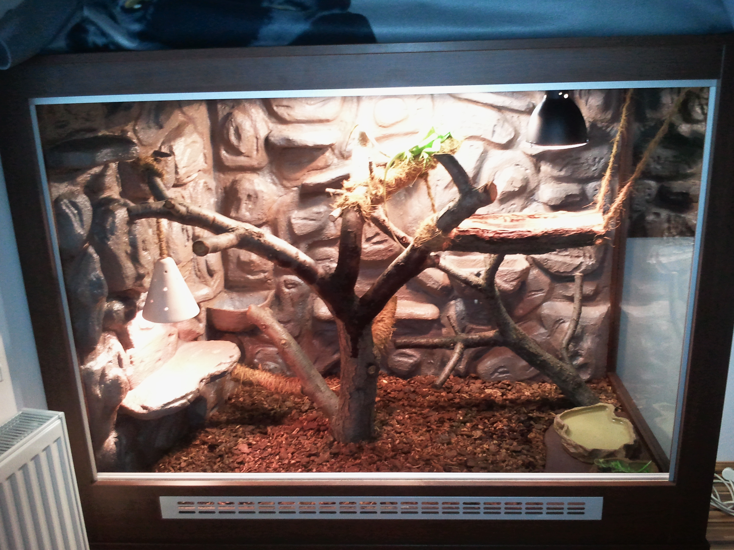 terárium je 1,7m široké, hluboké a vyské je metr.. větve na lezení, odvětrávání, 2 výhřevná místa, žárovky s uvb, teplota terária cca 26,vlhkost mezi 60\-\90\%.