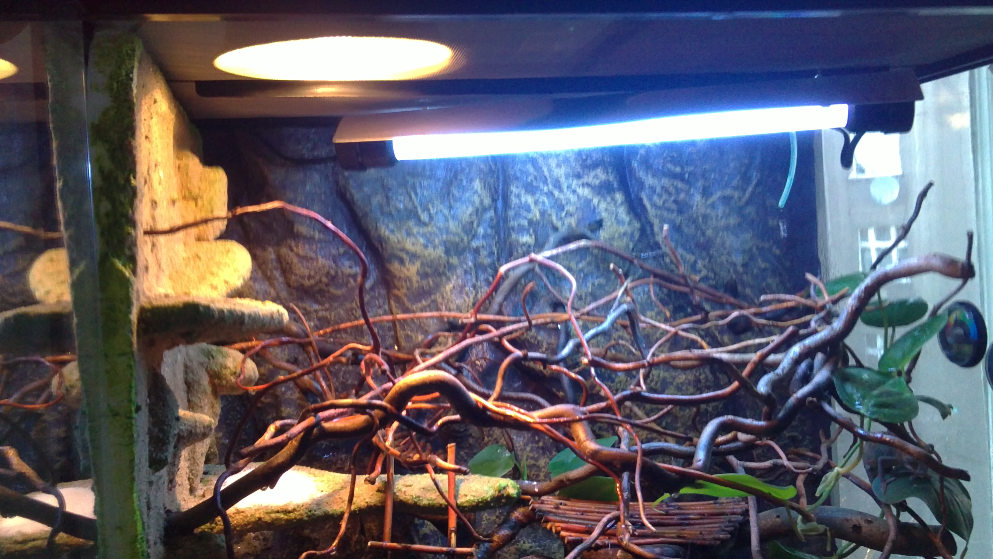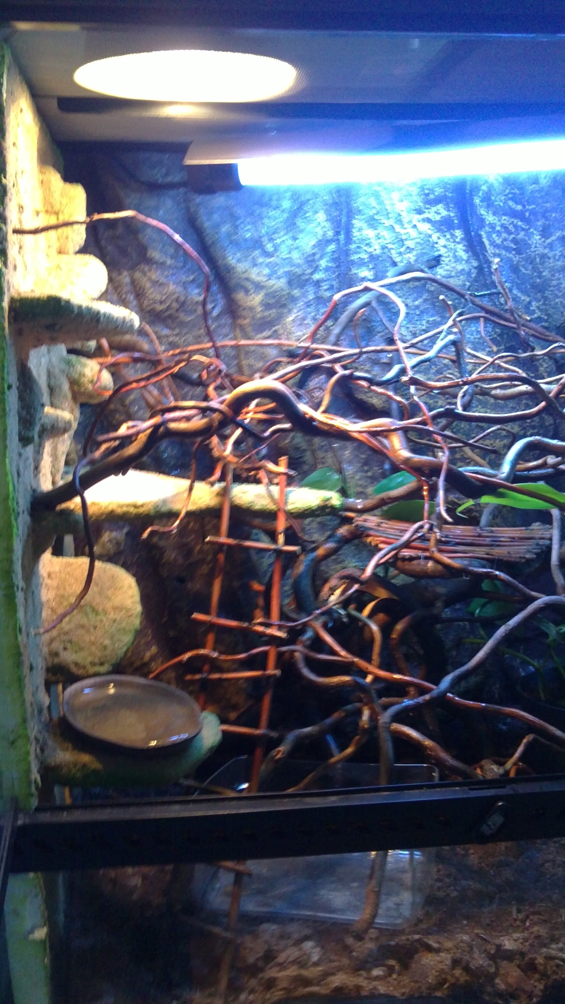 Náš chamík jemeňák 6 měsíců starý, terárium exoterra 60x45x60, světla osram 40 (teplo), repti glo 10.0 (UVB), obě svítí od 8h do 20h, vitamíny: reptivite 1x týdně, biominH 5x týdně, žere 10 cvřků denně, pije, teplota v teráriu 25-35°C