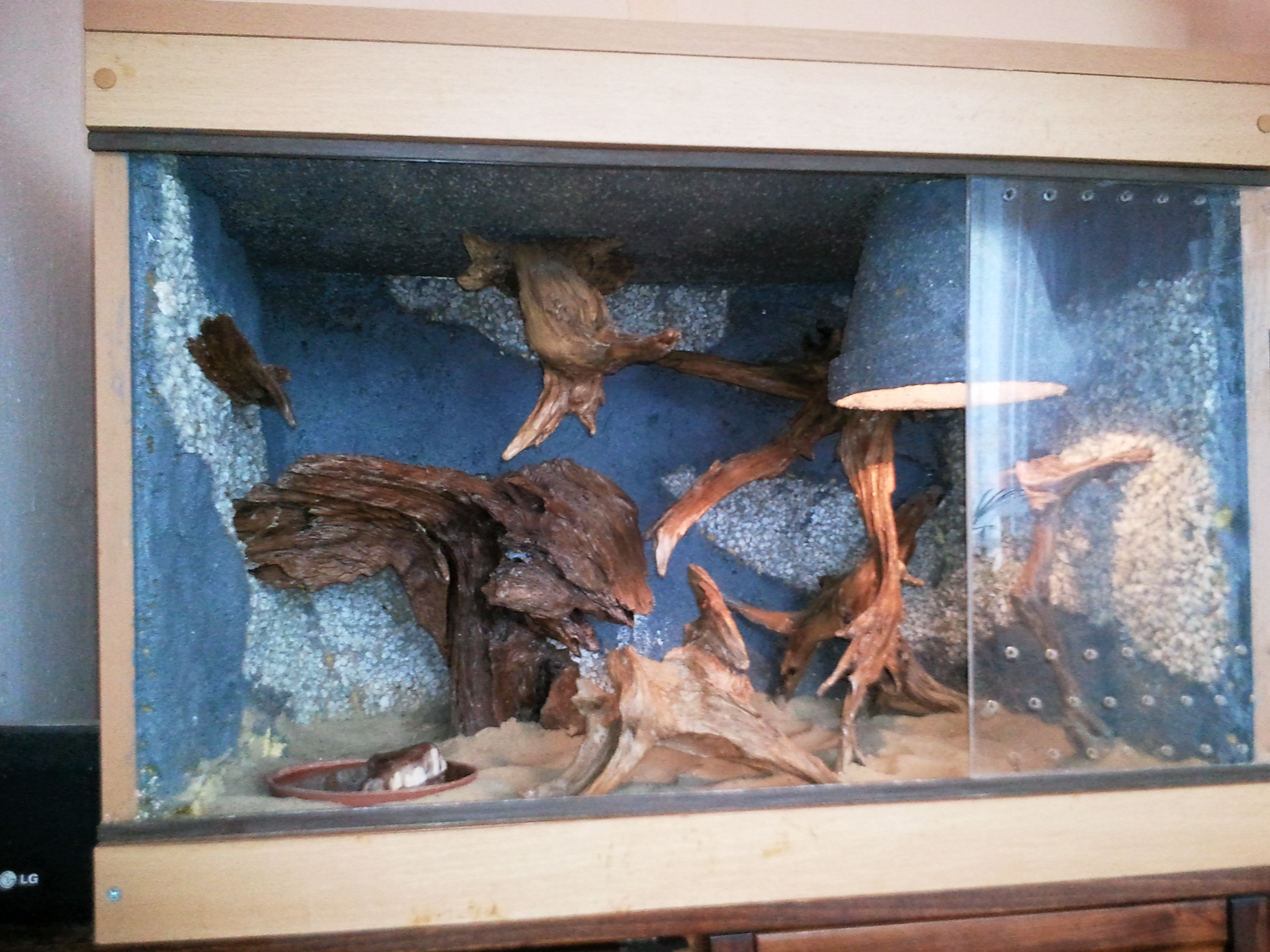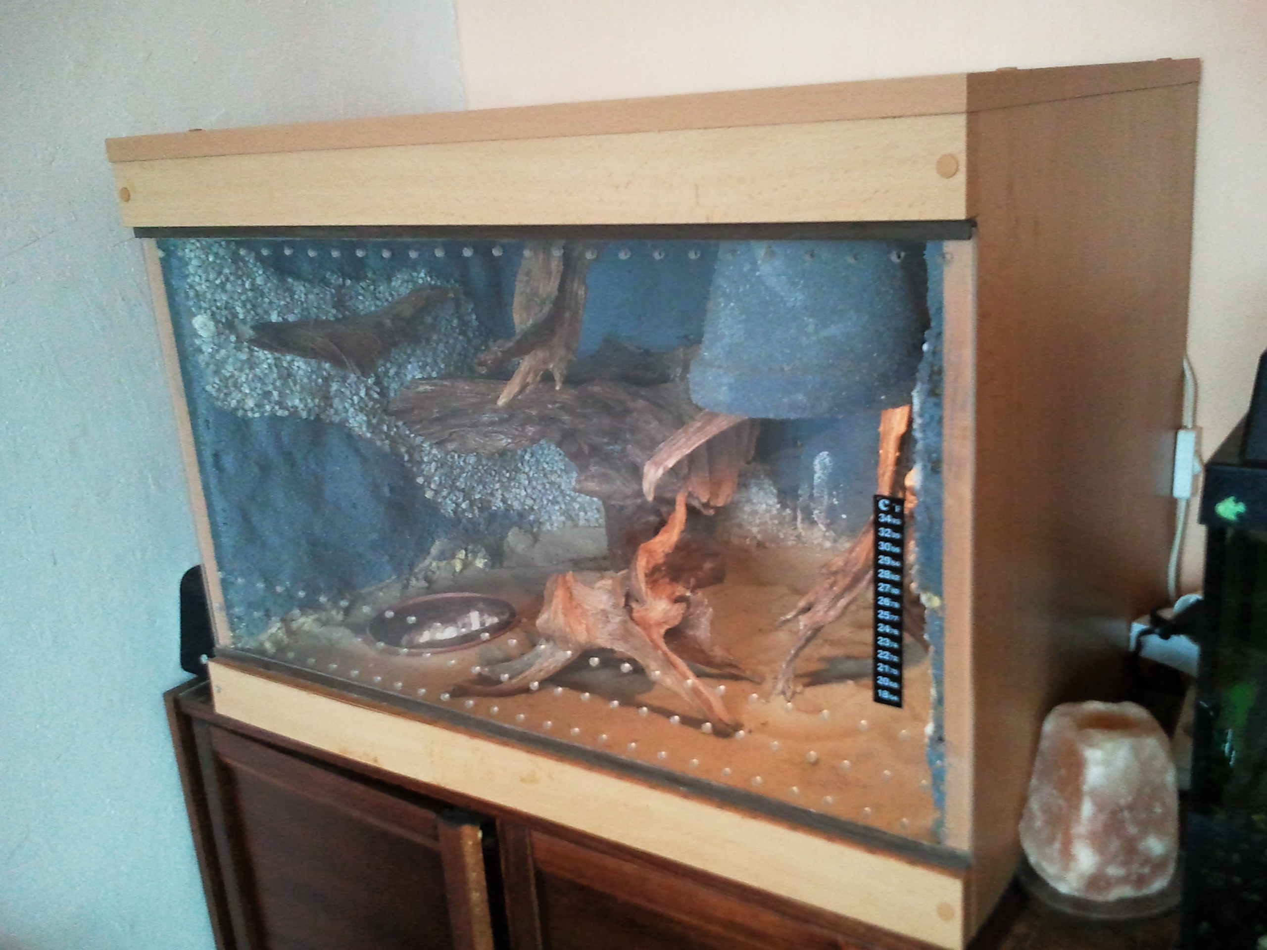 Dobrý den, prodám 2 roky staré terárium pro užovku a jiné menší hady. Terárium bylo vyhotoveno na míru, je vytvořeno z dýhované dřevotřísky s dekorem buk. Rozměry terária jsou 50x50x70(vxšxd). V teráriu jsou 3 samorosty,teploměr,osvětlení-vyhřívání a 3D pozadí. V minulosti bylo součástí i malé jezírko,které ale bohužel naše užovka opotřebováním zničila. Na podlaze terária a jako strop slouží utěsněná plexiskla,která ve spodní části zabraňují prosáknutí tekutiny na dřevotřísku,ve vrchní části jsou v plexiskle vyvrtané otvory pro odvětrávání a osvětlení. V teráriu je také dobře vyřešené odvětrávání. Jedinou vadou terária je to,že když nám had zničil jezírko,voda z něj se vylila na přední dřevotřískovou desku,která je teď mírně ohnutá a druhou věc,kterou je potřeba vyměnit je čelní plexisklo. Nám se bohužel povedlo původní sklo rozbít,takže dočasně jsme řešili plexisklem,ale v tuto chvíli se nám již nějaká oprava nevyplatí. K teráriu mohu také přidat několik kusů samorostů. Terárko je v tuto chvíli v havířově,ale není problém dovést do blízkého okolí.Pouze osobní odběr. Původní cena terária je 6000 Kč. Protože na prodej opravdu spěchám, nechci se dívat na terárium po mém hadíkovi, a vzhledem k tomu,že je potřeba udělat nějaké mírné oprav v řádech cca 100 korun,nyní jej nabízím za 4000 Kč. V případě rychlého jednání jsem schopna cenu ještě snížit.