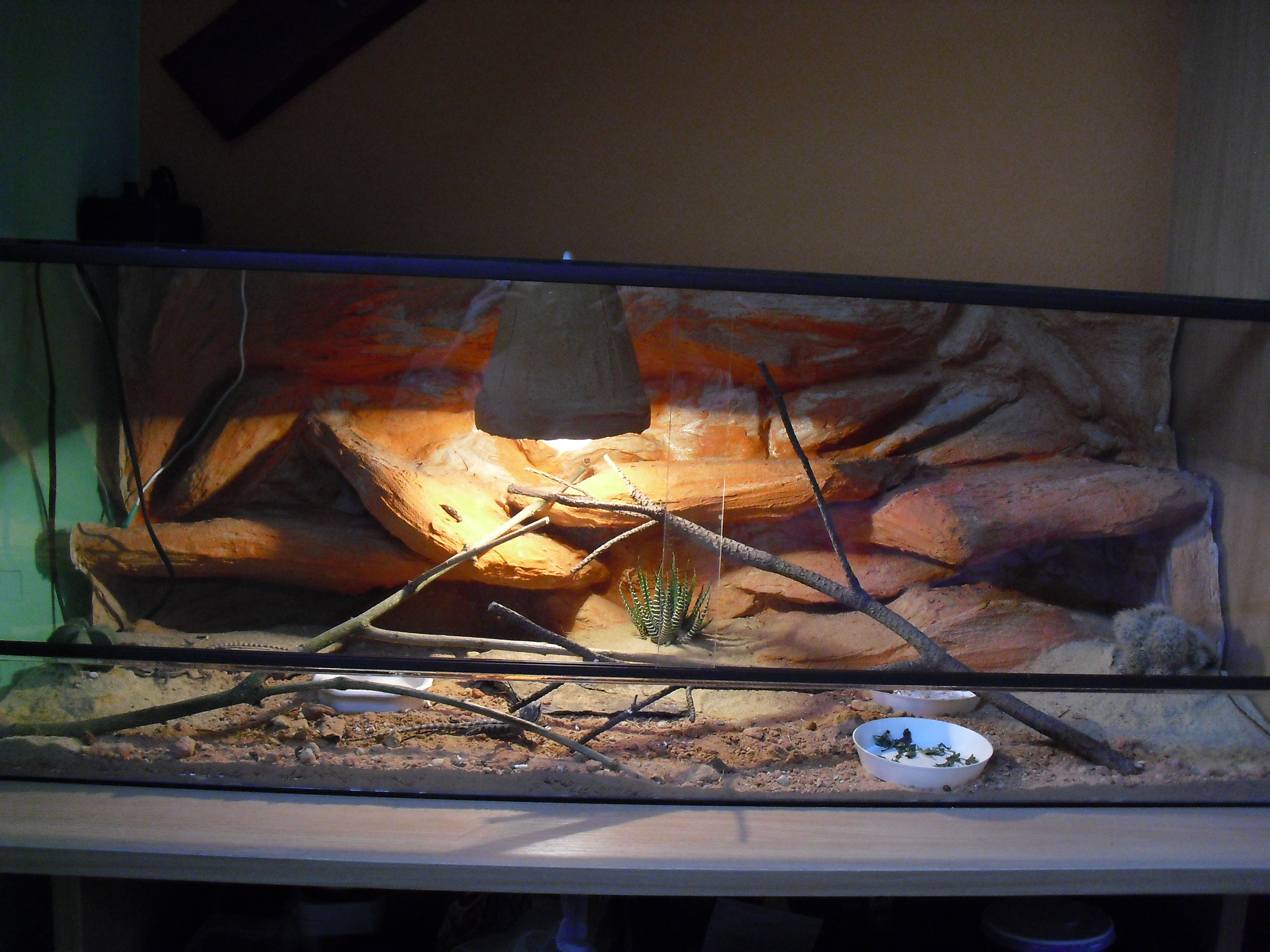 terárko 100-50-40, pod světlem cca 45 stupnů, v chladnější části cca 26 stupňů, miska s vodou, zelen…