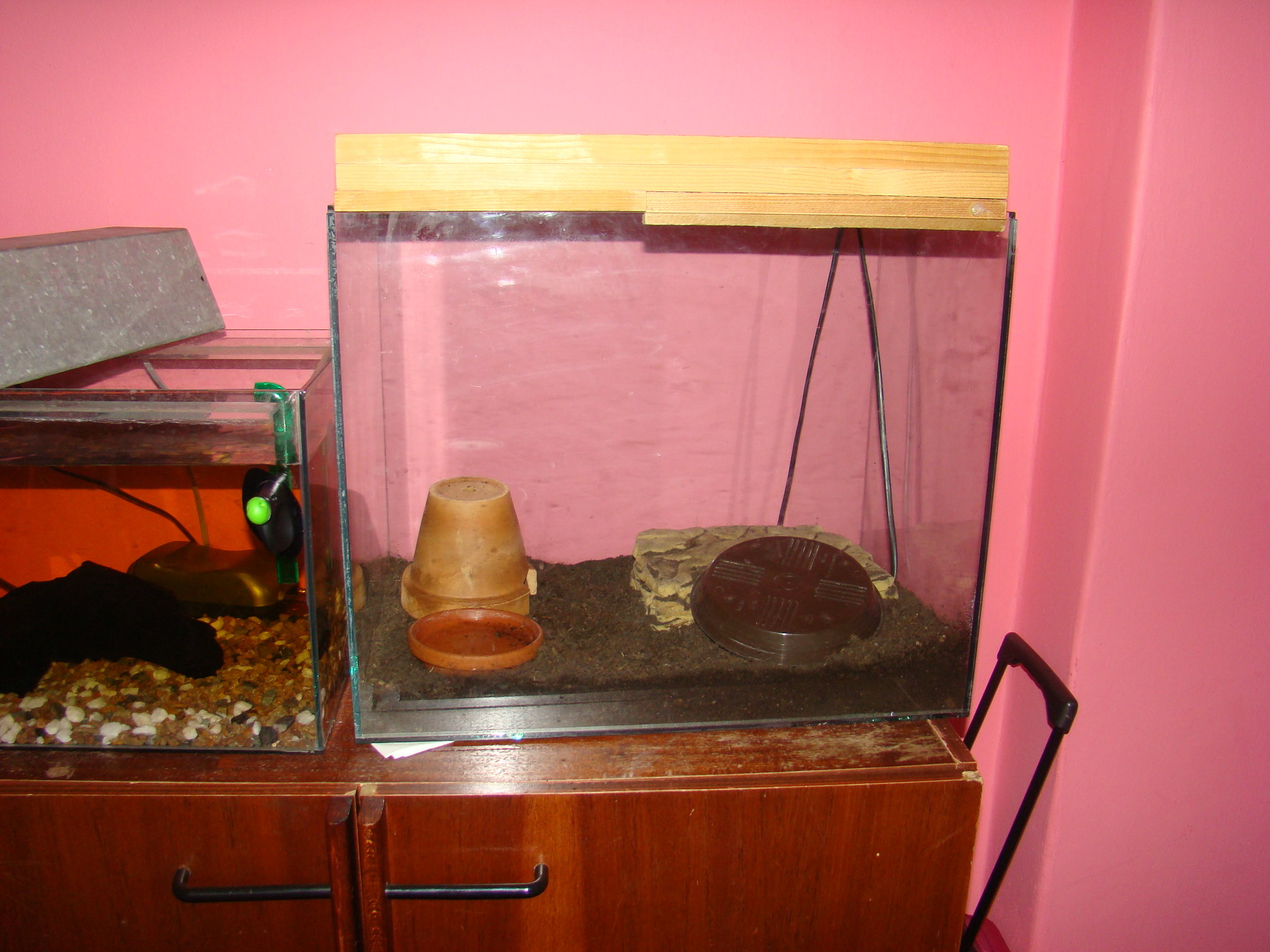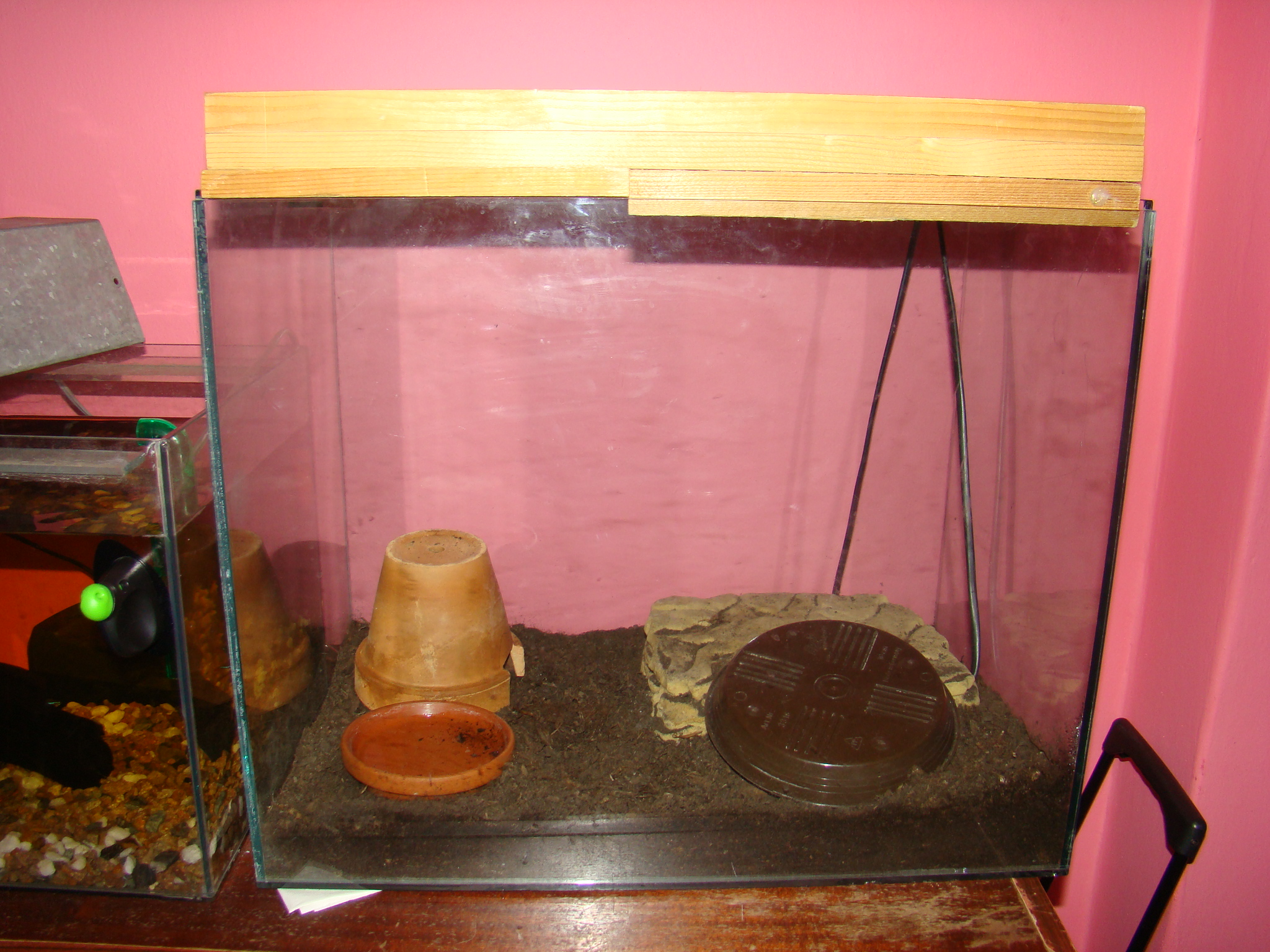 udělej něco s tím tera je to dost holobyt a gutce se tam rozhodně líbit nebude. To zavírání je neštastné, nemáš to dotěsněné a gutka ti z toho škvírama uteče. Druhý problém bych viděl, že ti tam rozhodně nebude fungovat koloběh vzduchu(tou malou mřížkou na víku to nespasíš...proto je terárko terárkem a akvárko akvárkem)