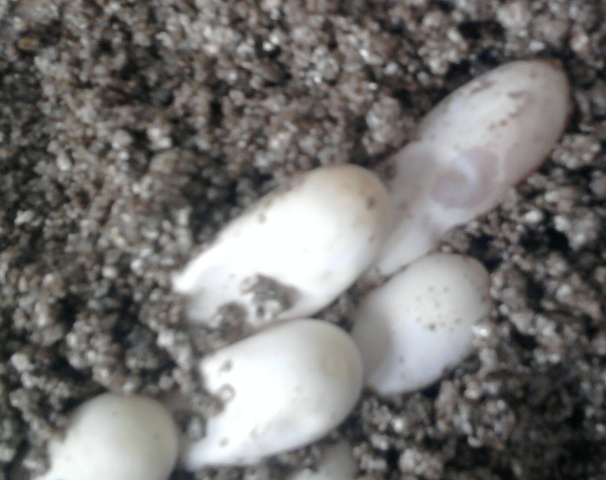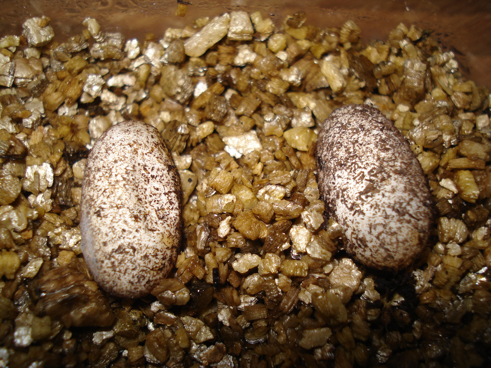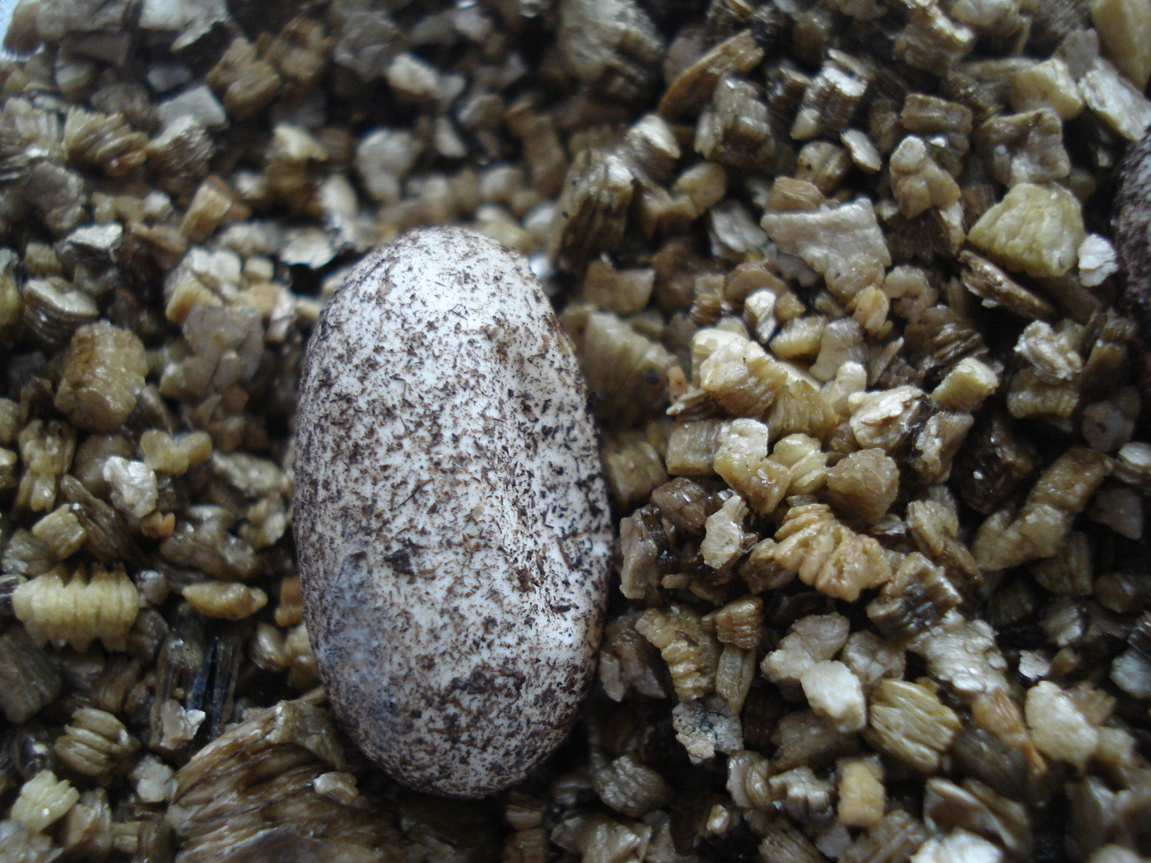 Nejsem si jistý, ale mohlo by to být způsobeno větší vlhkostí ve vzduchu, protože dřívější problém byl, že se mi vejce splaskla tak jsem zvětšil vlhkost no a u prvního vejce se naskytl problém, byla to opravdu malinká skvrna na špičce. Ze spoda jsou vejce krásná, bílá bez náznaku škůdců nebo plísně. Jenom jedno vejce z 6 je celé bílé, zbytek trošku nažloutlý, jedno je viditelně zasaženo asi do 1/3 a jedno mírně na špičce, pravidelně plíseň seškrabávám, jinou možnost jsem neměl a zatím se vejce drží. O tom jsem taky četl na ifauně, někdo měl stejný problém jako já, postupoval stejně až do vylíhnutí, psal 100% líhnivost a bez známek poškození. Dneska kolem 15:00 provedu zásyp. Teplota 27-28 stupnu a vlhkost neměřím, akorát když zmáčknu vermikulit, nespadne ani jedna kapka, ale dělají se hrutky.