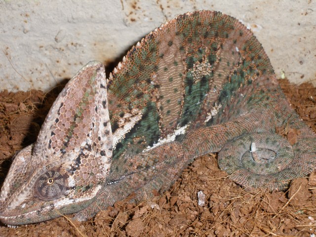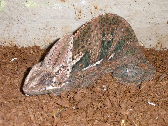 Podmínky chovu je třeba rozepsat detailněji. Fotografie terária rozhodně pomůže, ale to zvíře opravdu vypadá v mizerném stavu. Je jedno, jestli je lignocel jen v rohu, nebo na celém povrchu. Každopádně jej zvíře mohlo pozřít. A pokud je i ve střední části terária 29°C, musí být ten chameleon přehřátý. Jak máte řešené větrání? Už se Vás tady ptali. A jak dlouho ho máte v téhle nádrži? Celých 11 měsíců?