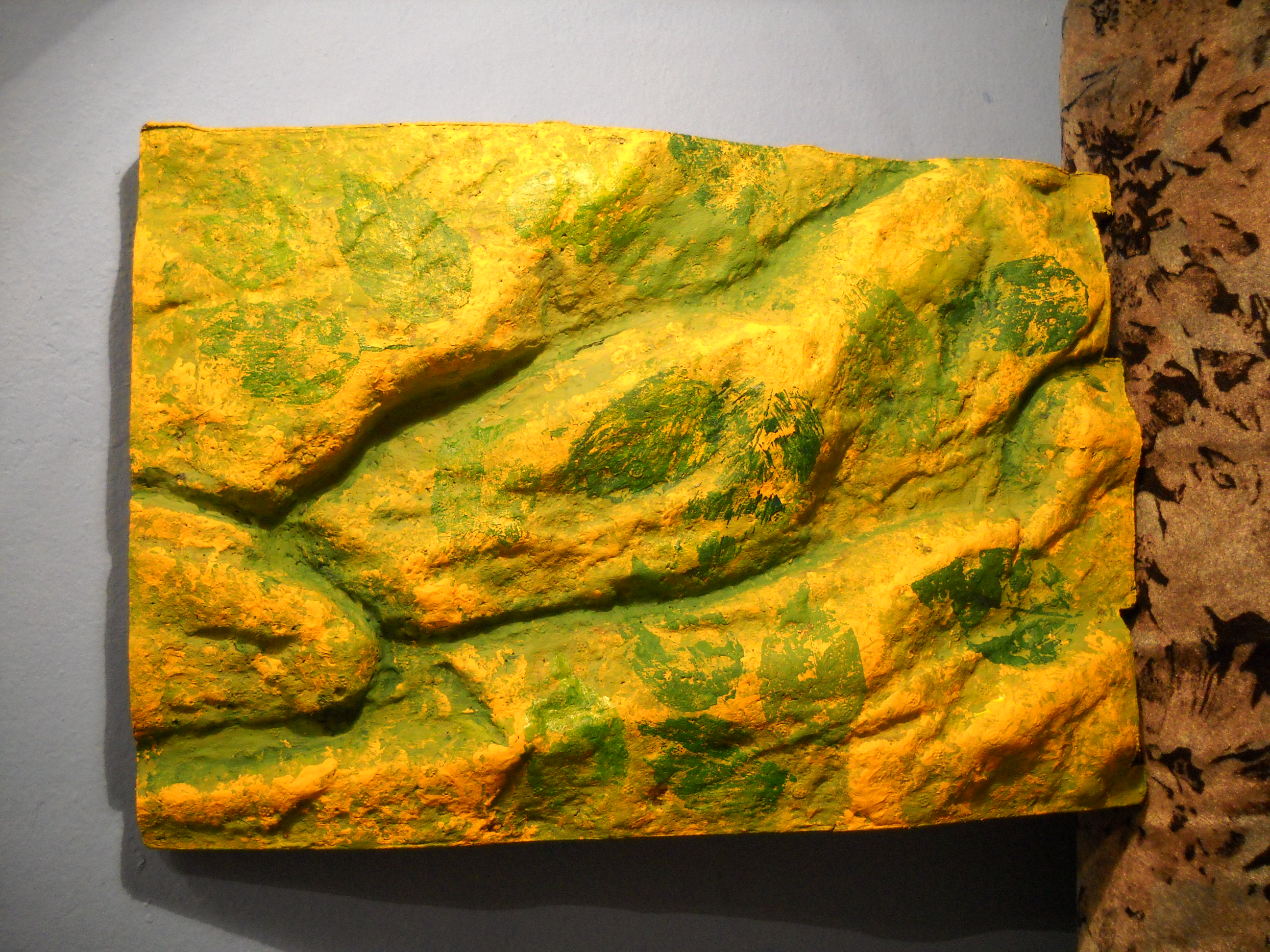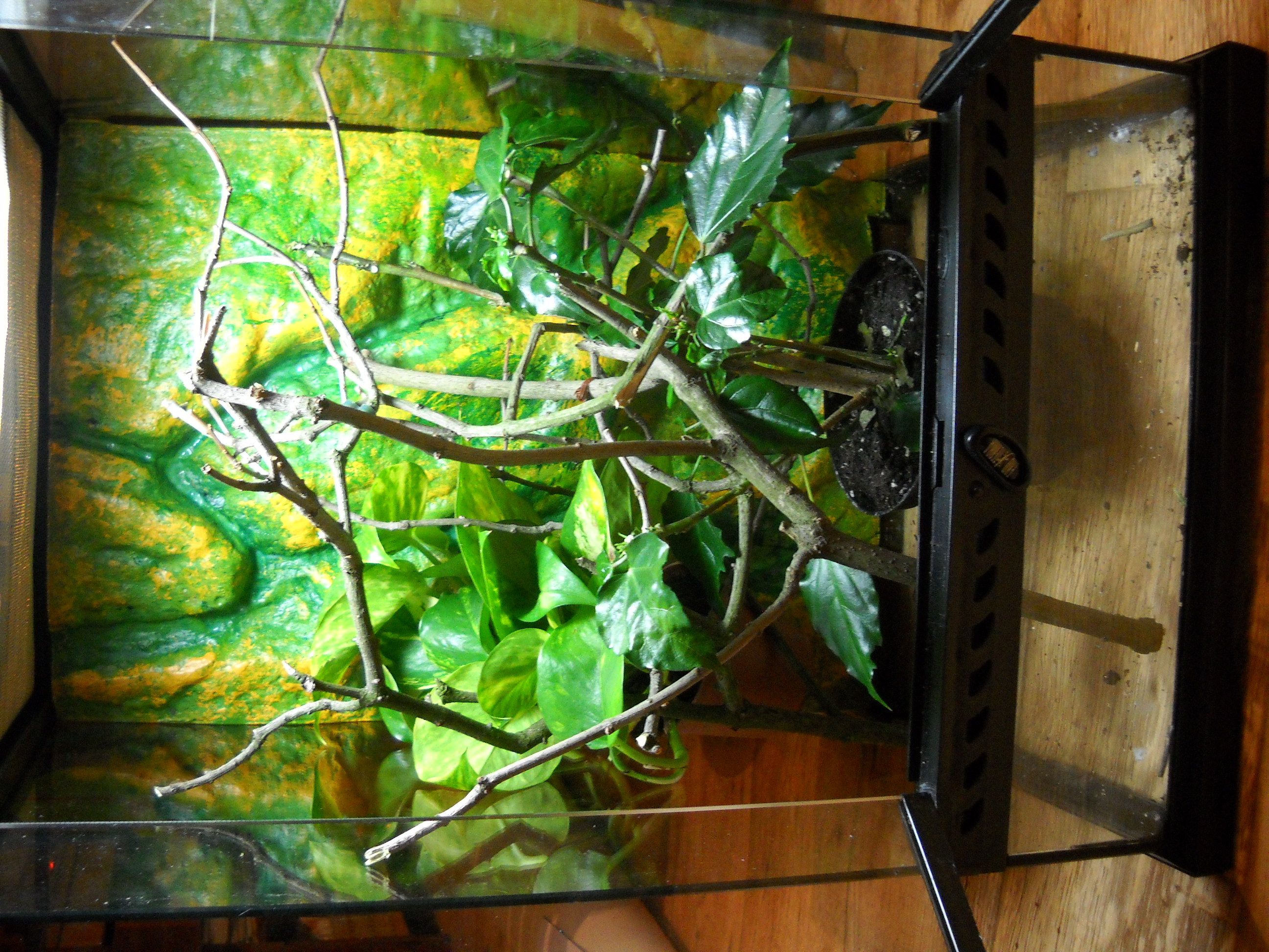 Tak zatím dávám jenom fotku předělaného pozadí.Ty barvy vůbec neodpovídají reálu. Ta žlutá je to okr a ta jedovatá zelená je khaki. Oškubala jsem listy ze stromu a obtiskla je na to. Teď už jen nanést krycí vrstvu laku. Myslím že to bude vypadat líp než to původní tmavé od exotery :) Zítra to nainstaluji do terária a uvidím jak to bude vypadat po nasvícení.