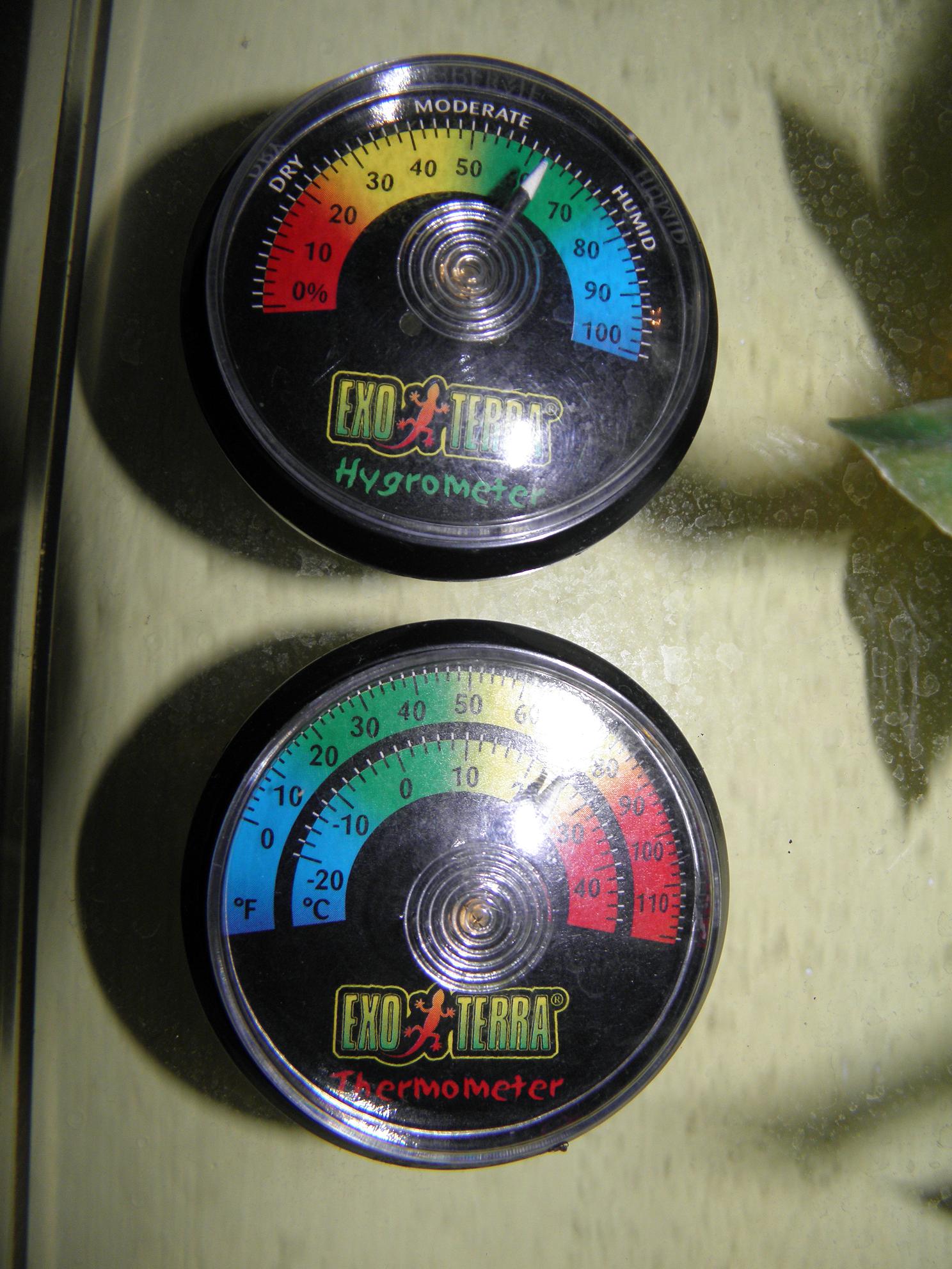 Ad měření teplot, na to taky není potřeba budíček s nápisem Exo Terra. Obyč pokojový teploměr, na nějakou chvíli (jeden den) umístěný nejdřív pod zdroj světla, pak do prostředku terárka a pak na zem taky podá požadované informace.