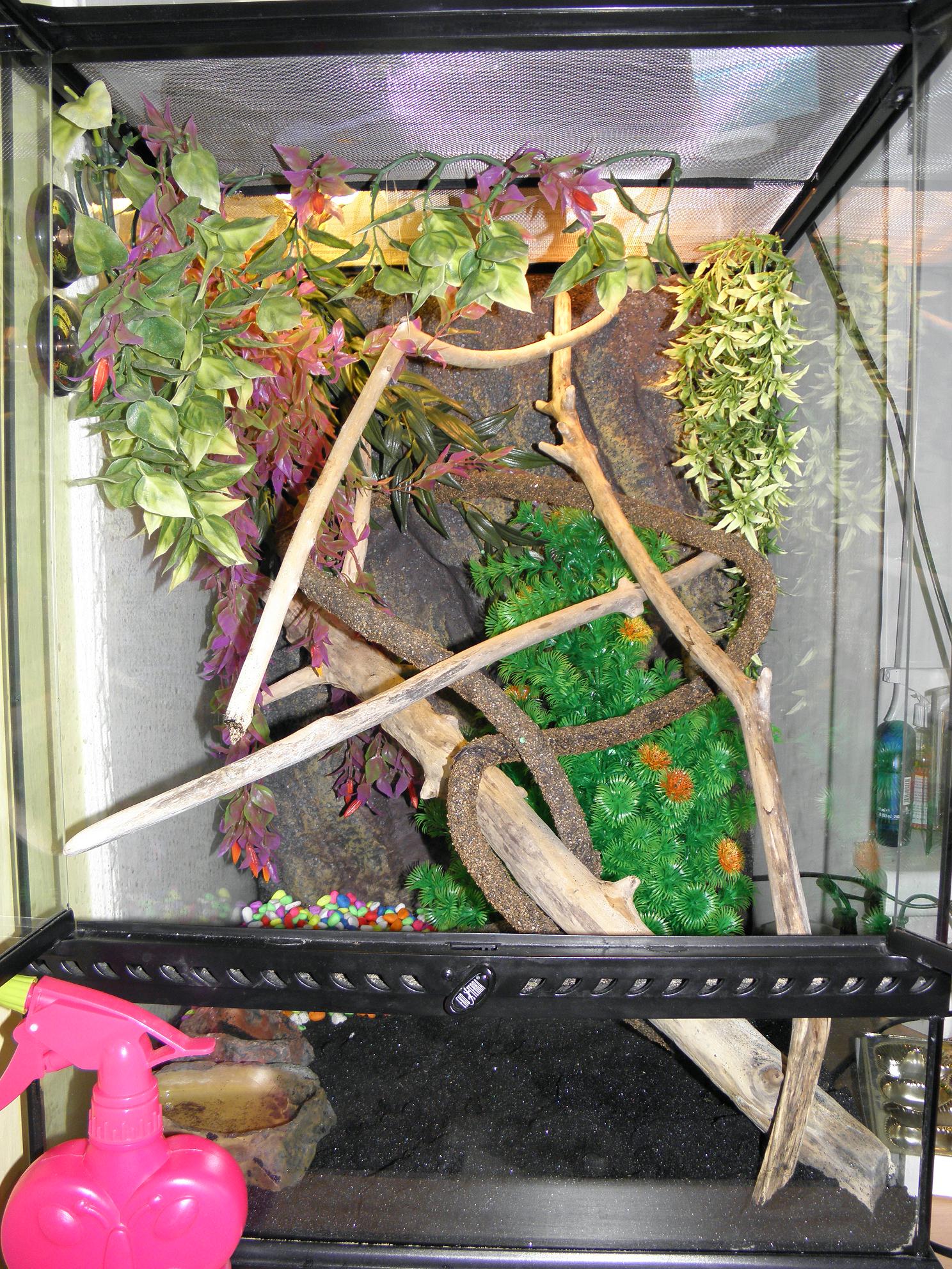 jinak osobně bych tam dal úplně jiné větve.. ty klacky co tam máte, jsou jak na psa :/ zkuste kroucenou vrbu nebo jiné tenčí větvičky. NE z jehličnatých stromů - pouští smolu bo smůlu :D a červy mouční obsahují příliš tuku, ty ani nedávejte.. njn. to jsou ty zlatý věci z exoterry ;) ať Vám přítel zbouchá nějaký rozumný terko z OSB desek a máte vyhráno.. pokud reaguje tak jak říkáte, tak bude problém opravdu v tom větrání