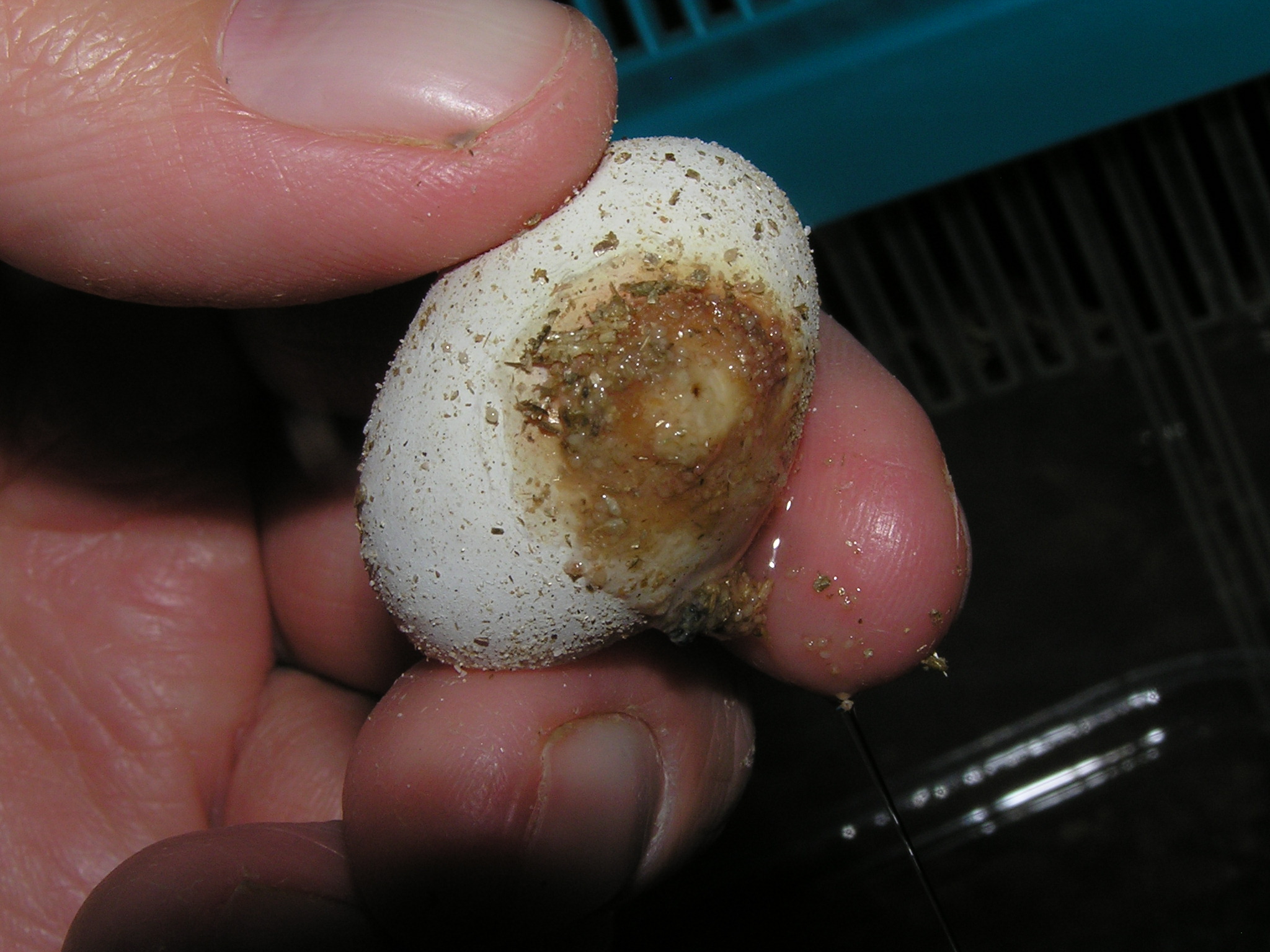Před nějakou dobou jsem koupila na burze vermikulit a zřejmě jsem si s ním zavlekla roztoče, kteří mi v inkubátoru napadají a ničí snůšky vajec plazů. Napadené vejce se jeví jako zdravé a na povrchu není nic vidět, ale pak najednou rychle zkolabuje a když jej zdvihnu, zjistím, že je zespodu napadené a prožrané od roztočů. Ještě nenapadená vejce jsem několikrát přendala do čistých nádob s novým sterilizovaným substrátem a vydesinfikovala inkubátory, ale roztoči se vždycky zase objeví a nějaká vejce zničí, zřejmě stále někteří (malá vývojová stadia) zůstávají na nějakých vejcích a nejsou vidět do doby, než se zase namnoží a způsobí škodu, viz přiložené fotografie. Na první fotografii je zdravě vypadající vejce a na dalších totéž vejce po zdvihnutí.