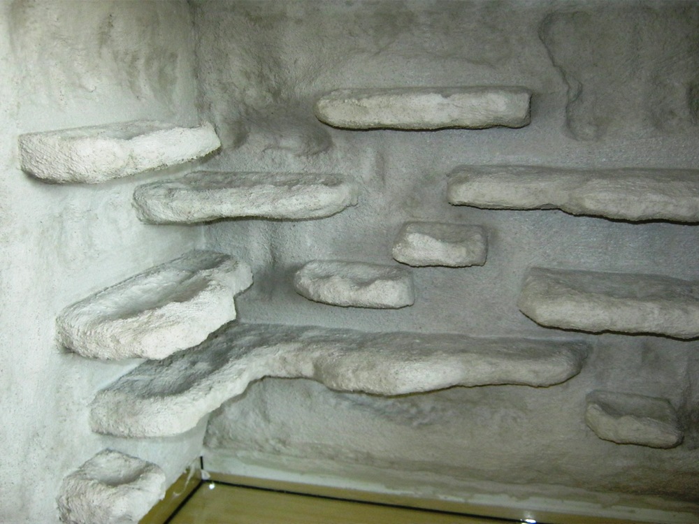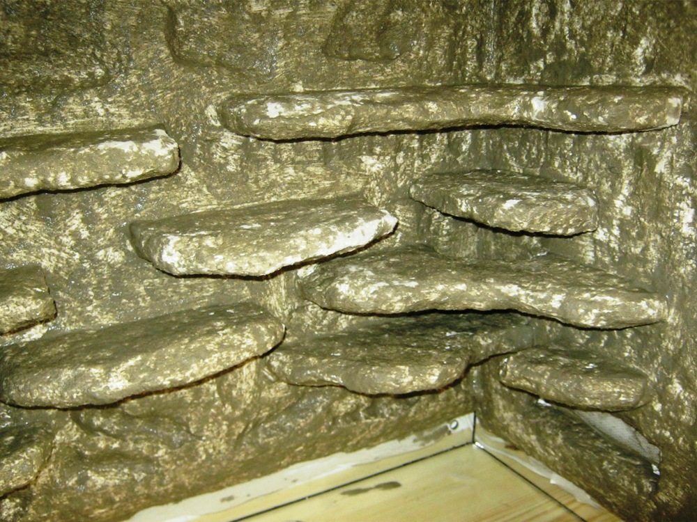 2) Nařezat polystyren (dělal jsem pájkou) a následné vytvarování (také pájkou), tvarování asi doporučuji až po nalepení polyše na stěnu terárka (např. silikonem). Poté nanést vrstvu lepidla a nechat zaschnout, poté nanést druhou a po zaschnutí třetí vrstvu, která může obsahovat kamínky, zase ne moc aby se vám to neodrolilo