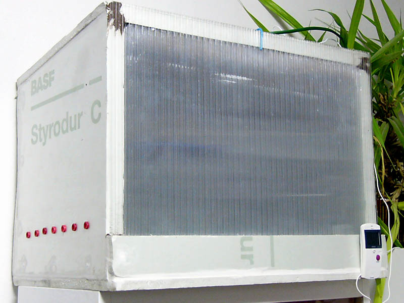 Úplně jednoduchý inkubátor, vyrobený narychlo, původně na jedno pužití. Je ze zbytků tvrzeného polystyrenu (Styrodur), lepeno zbytky silikonů, co jsem doma našel (bílý, hnědý), spoje ještě posychrovány dlouhými vruty do dřeva. Přední víko - dvoukomůrkový polykarbonát, zajištěný jen ohnutám drátkem