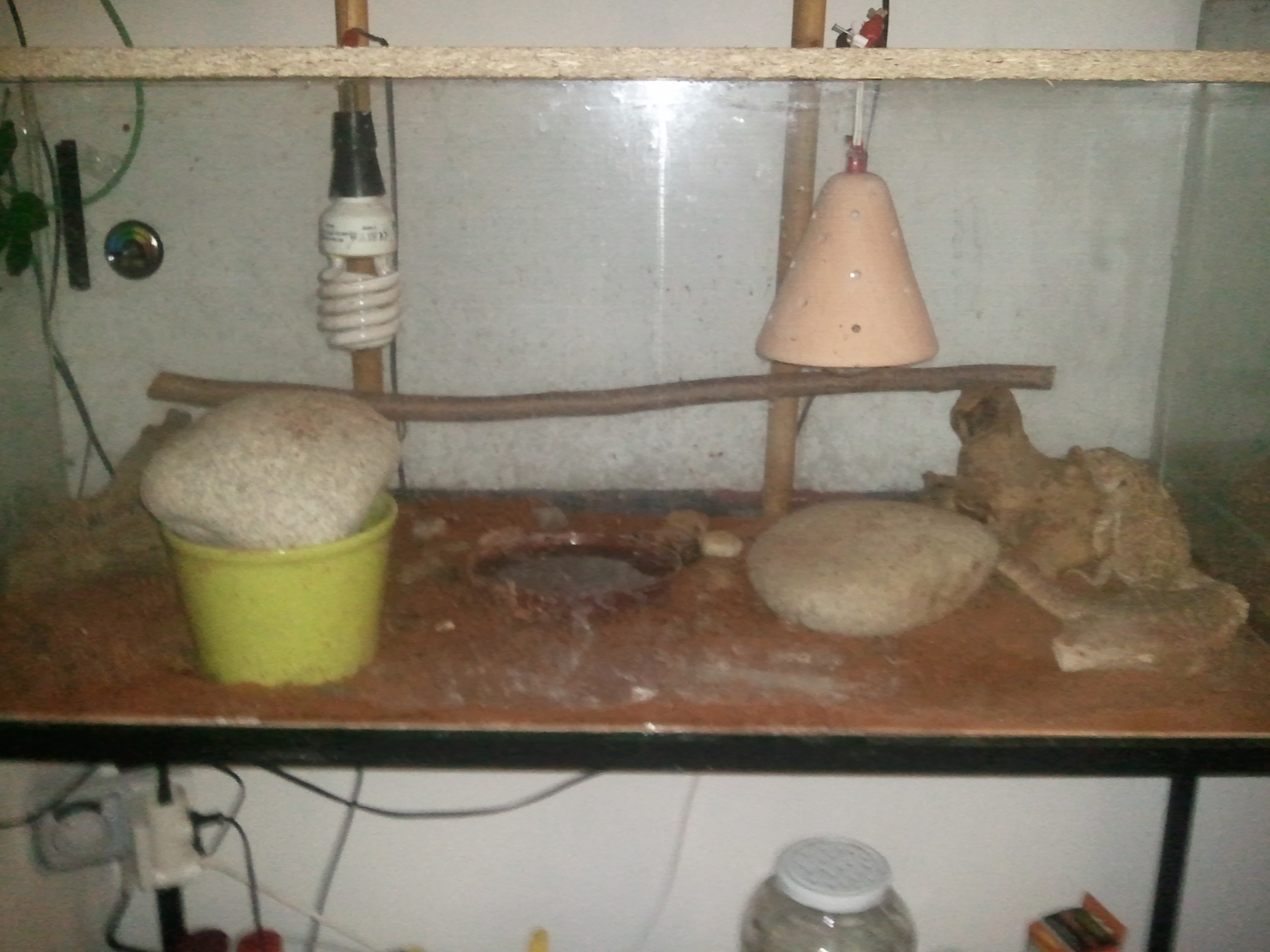 Terarium hrozne, zarizeni uplne nevhodne. Predpokladam ze je to z akvaria, akvarium nerovna se terarium. Nechapu smysl balvanu v kvetinaci a klacku vzadu, vyhodit to ven. Tech moznosti jak to udelat jinak a lip je tintilion - hlavne neco rozumne po cem by mohly lozit, ten "UV" kompakt dat tam kde se s oblibou zdrzuji (do max. 20-25cm od nich, jinak nema moc smysl), ta obri miska s vodou je celkem zbytecna, misku ano - ale mensi, klidne nekde v koutku. Linearku nahoru jak jsem psal, at maji svetlo vsude, v celem prostoru. Pokud neni mozne kvuli financim resit ted hned skutecne terarium misto akvarka, tak aspon se snazit o slusne vetrany strop - a do budoucna proste koupit terarium = dvirka vepredu, vetrani jak dole tak i nahore. Taky to usnadni uklid, ted to vypada dost zanedbane. :-( Jinak viz co pise Mad Mike - v tomhle spokojene nebudou.