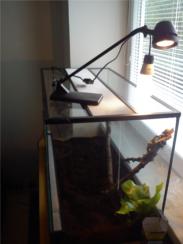 Největší z nich byla rada s volbou terária - 80*40*50-výška. Po pročítání fór a stránek jsem se zhrozil. Naštěstí nám terárium vymění za 40*50*80, bude to bohužel až v pátek (23.6.). Z toho vyplývá, že do něj nemohu dělat žádné úpravy. Prozatím mám nad ním ExoTerra UVA žárovku + obyč. Dávám mu cvrčky a nejsem si vůbec jist, zda-li je jí. Mám k nim i Roboran. Za chvíli jdeme do lesa a opatřím větve.