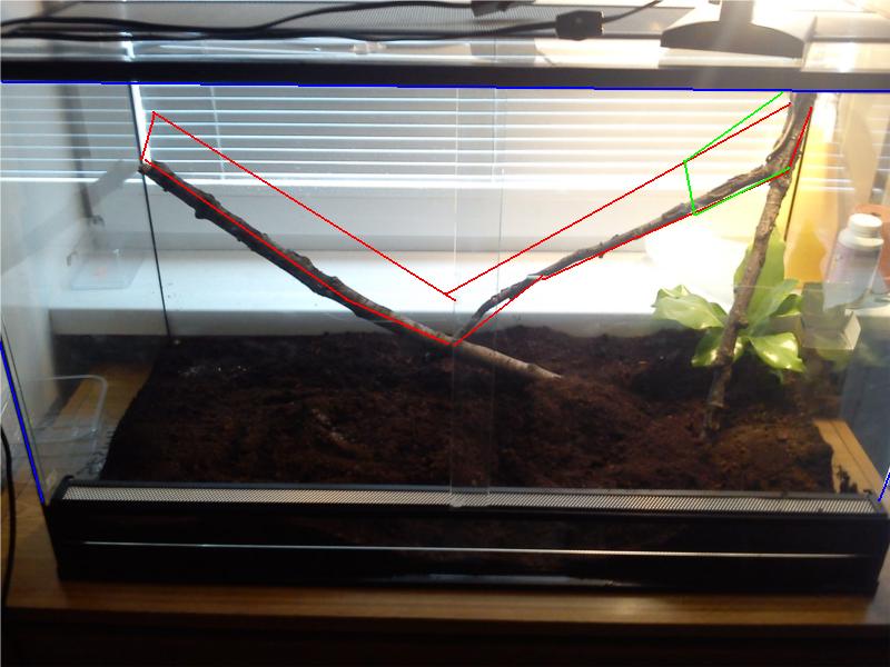 Koukej primarne pridat hodne, ale opravdu hodne horizontalnich vetvi, aby cervene ohranicenej prostor byl co nejvic shodnej z modre ohranicenym prostorem. Chameleoni fungujou i bez UVB svetla, s obcasnym dodanim vitaminu, minimalne to trva hodne dlouho nez padnou na avitaminozu - ale ostatni podminky musi bejt OK.
