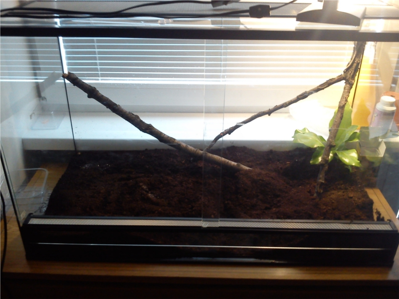 Největší z nich byla rada s volbou terária - 80*40*50-výška. Po pročítání fór a stránek jsem se zhrozil. Naštěstí nám terárium vymění za 40*50*80, bude to bohužel až v pátek (23.6.). Z toho vyplývá, že do něj nemohu dělat žádné úpravy. Prozatím mám nad ním ExoTerra UVA žárovku + obyč. Dávám mu cvrčky a nejsem si vůbec jist, zda-li je jí. Mám k nim i Roboran. Za chvíli jdeme do lesa a opatřím větve.
