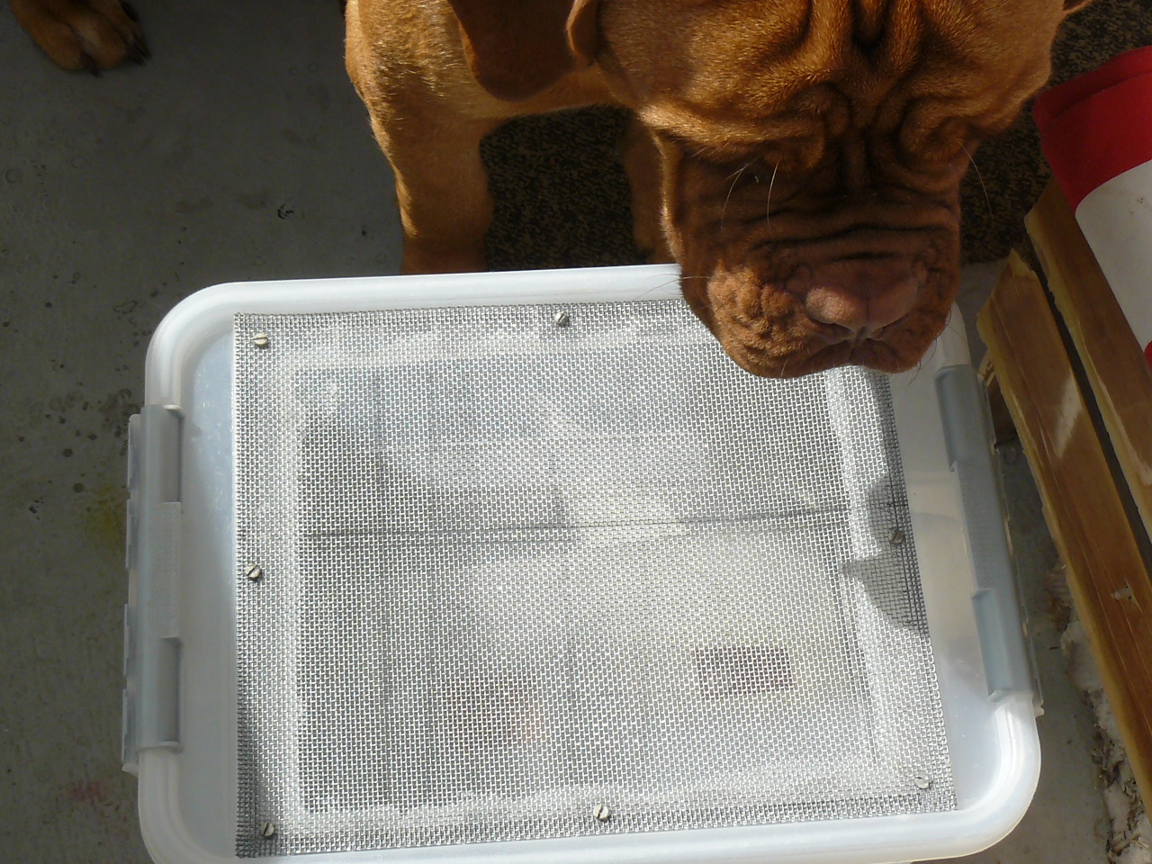 Krabice jsou z polypropylénu (PP), takže skvěle omyvatelné, ale už je to horší s možností lepení. Myslel jsem, že udělám větrání tak, že vyříznu do víka otvor patřičných rozměrů a přilepím zvnějšku ocelovou síťku proti hmyzu a přidělám to dalším kouskem plastu (z toho vyříznutého kusu - jako sendvič). Jenže jsem nesehnal lepidlo na polypropylén, které by bylo netoxické a omyvatelné.