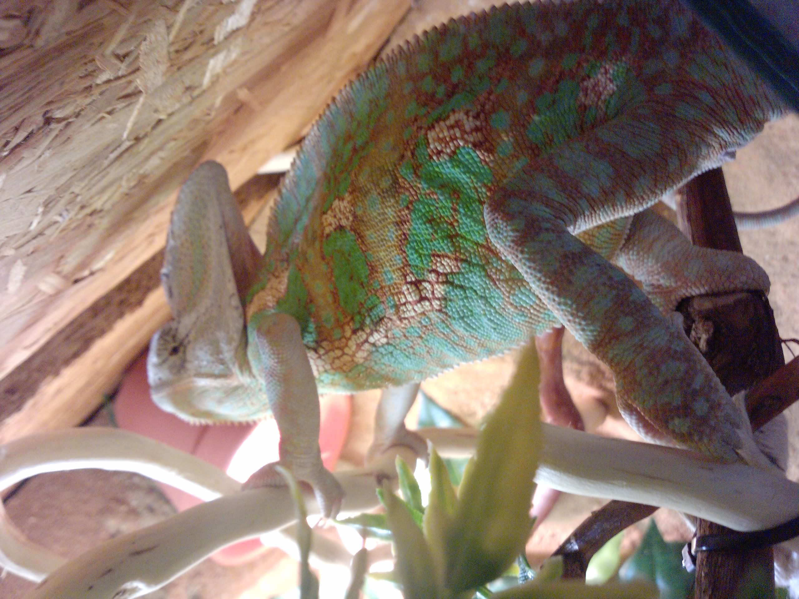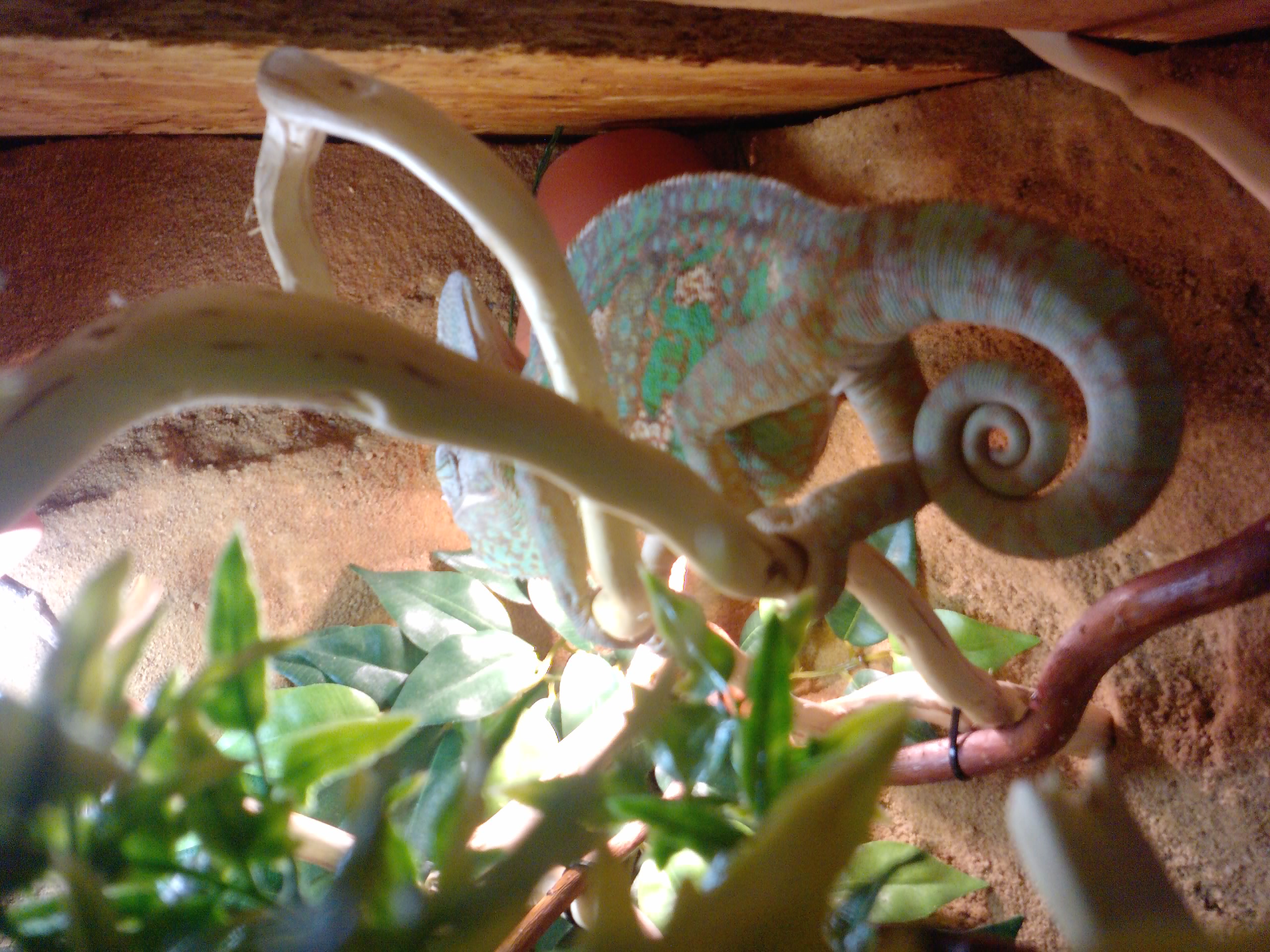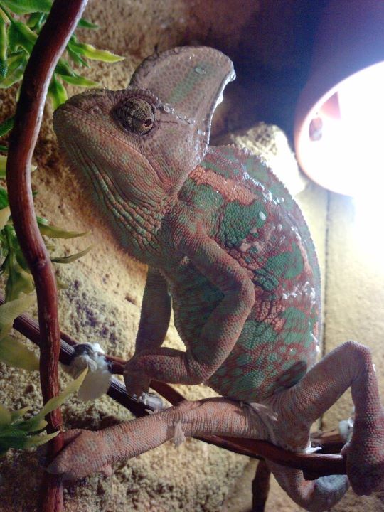 Jinak chameleon je čilý, nijak nepolehává ani se neschovává. Občas ho beru i ven do bytu, ale to jen když chce on (vleze si na větev v blízkosti kde otevírám terárium a šmátrá po skle, tak mu otevřu, přistavím rampu z kroucené vrby a on je tak 10-15 min mimo terárko, během toho se aspoň vyvětrá terárium.