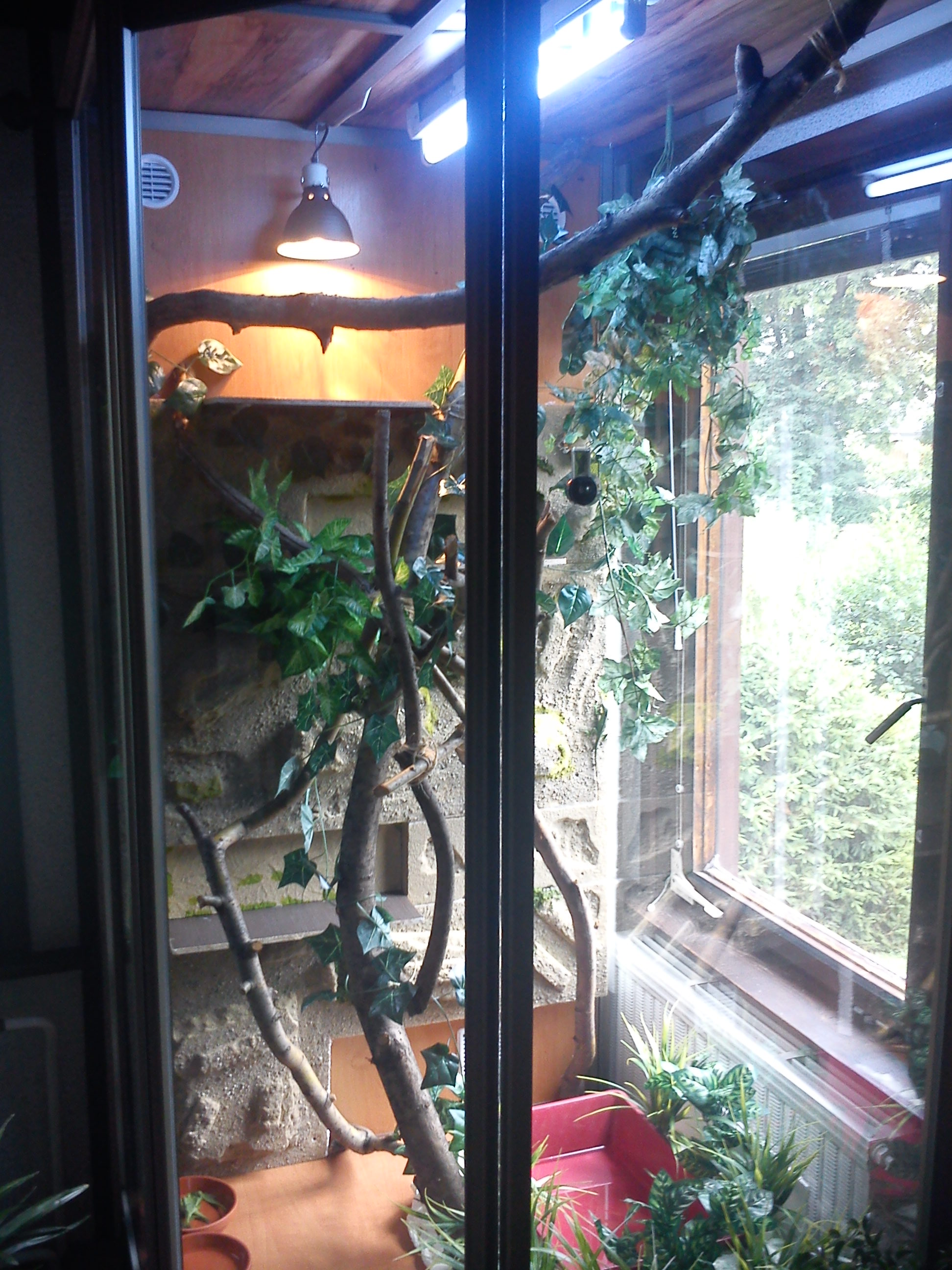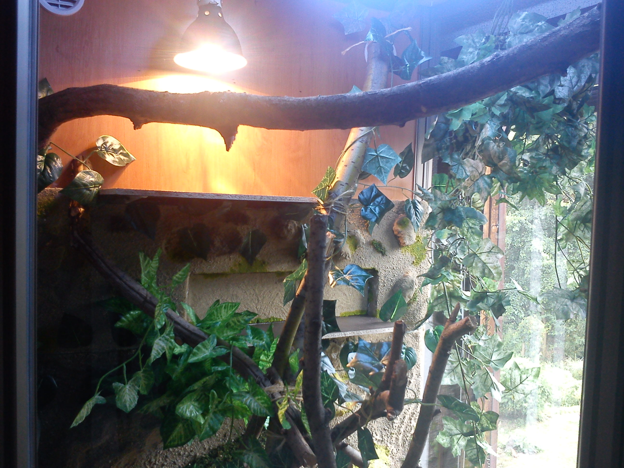zářivku nesnižuj, to by už hrozilo popálení zvířete. Takhle to tera vypadá celkem OK, ale ještě by to sneslo pár vodorovných větví.