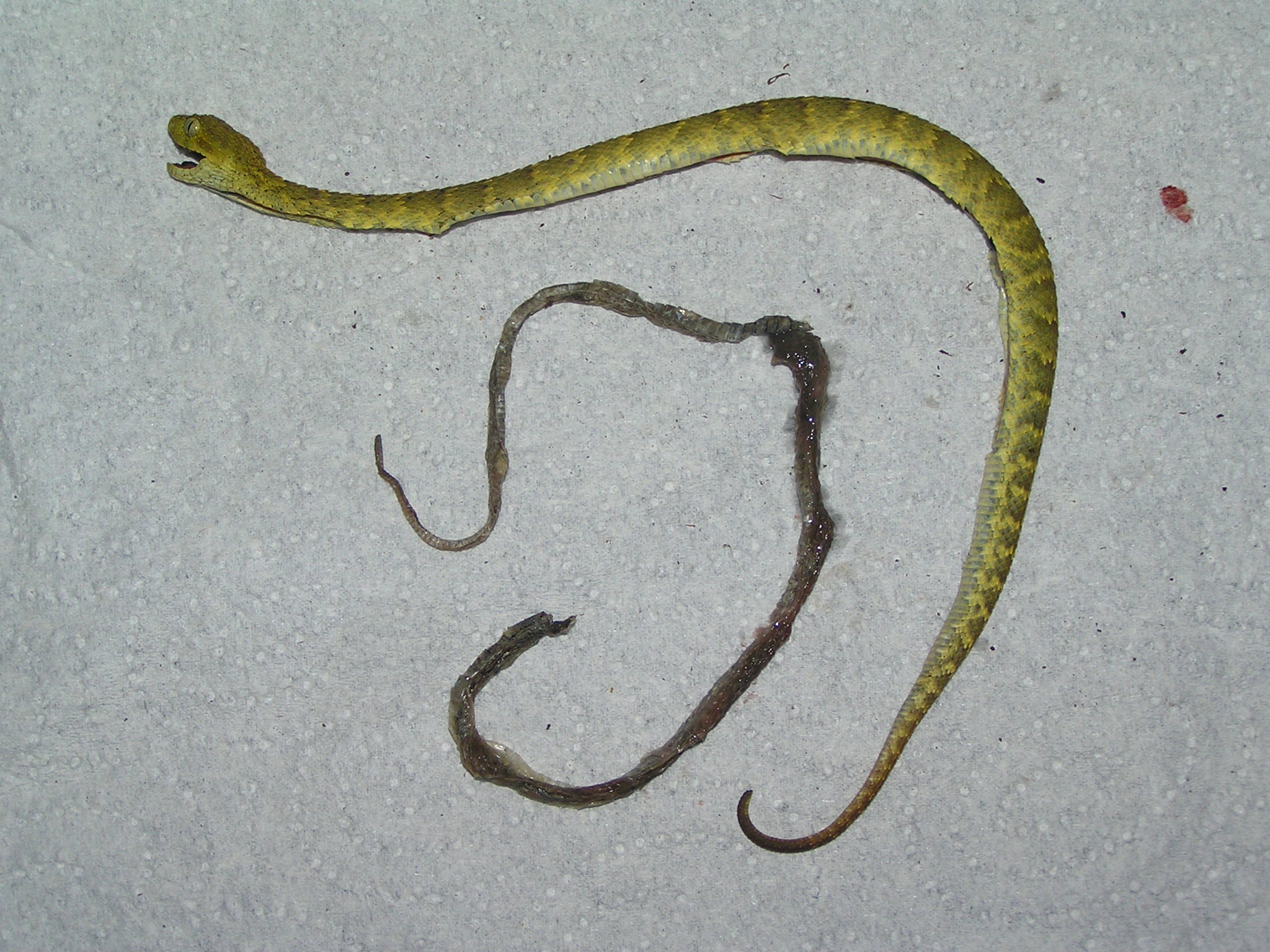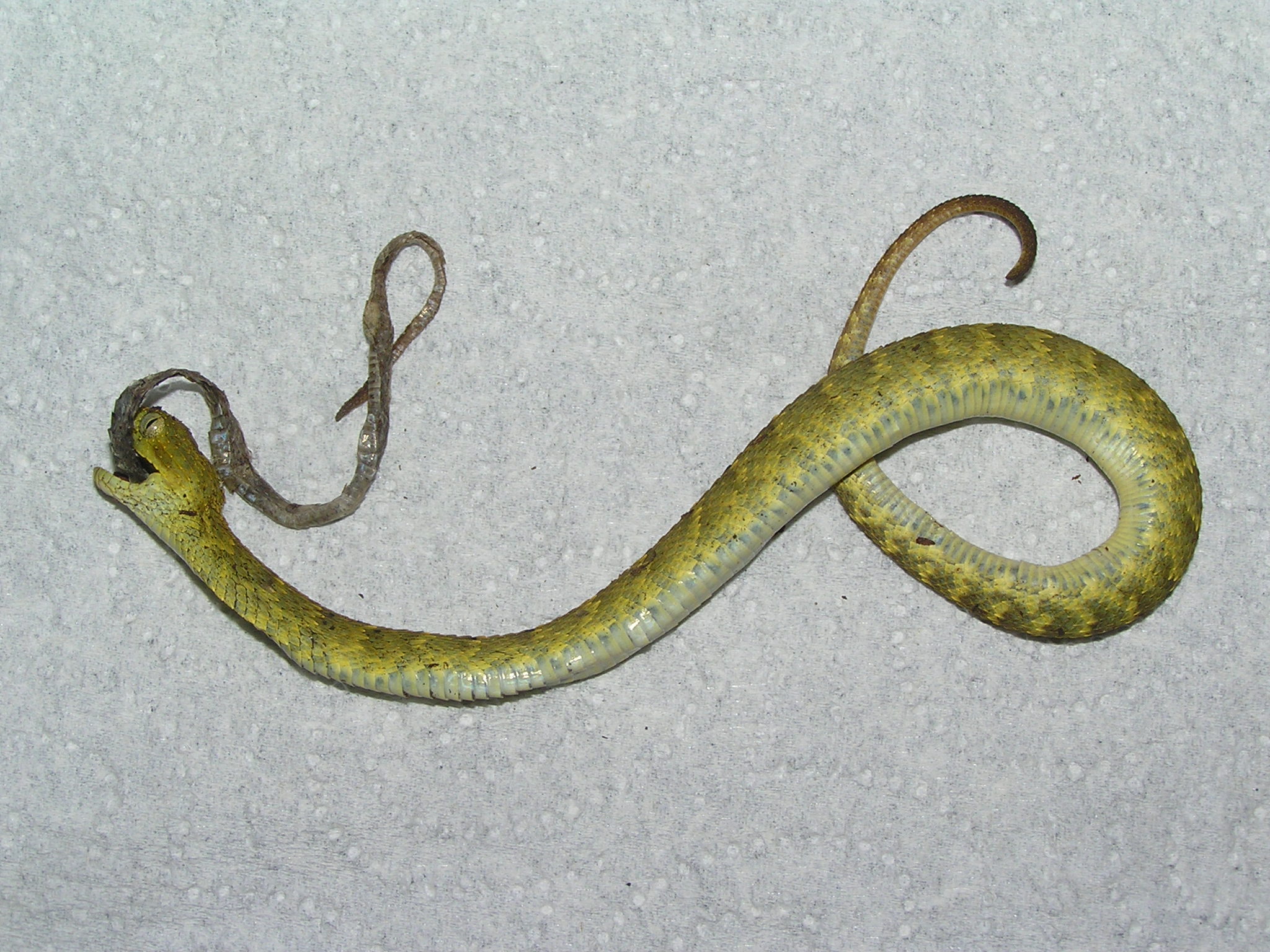 Aneb jak snadno a rychle přijít rovnou o 2 mláďata. Spíše pro zajímavost vkládám fotografie kanibalismu u 1 měsíc starých mláďat Atheris squamigera. 10 mláďat z jednoho vrhu bylo chováno společně v biotopně zařízené ubikaci rozměrů 60x45x60cm, všechna mláďata byla přibližně stejně velká. K pozření jednoho mláděte druhým došlo v období mezi dvěma krmeními. Jeden den bylo pozorováno mládě se zvětšeným objemem těla a jedno mládě v ubikaci chybělo. Po 3 dnech bylo mládě se zvětšeným objemem těla nalezeno uhynulé, z tlamky mu vyčníval kus nestrávené kůže jeho sourozence. Zřejmě uhynulo při pokusu vydávit kůži, kterou z nějakého důvodu nedokázalo strávit.