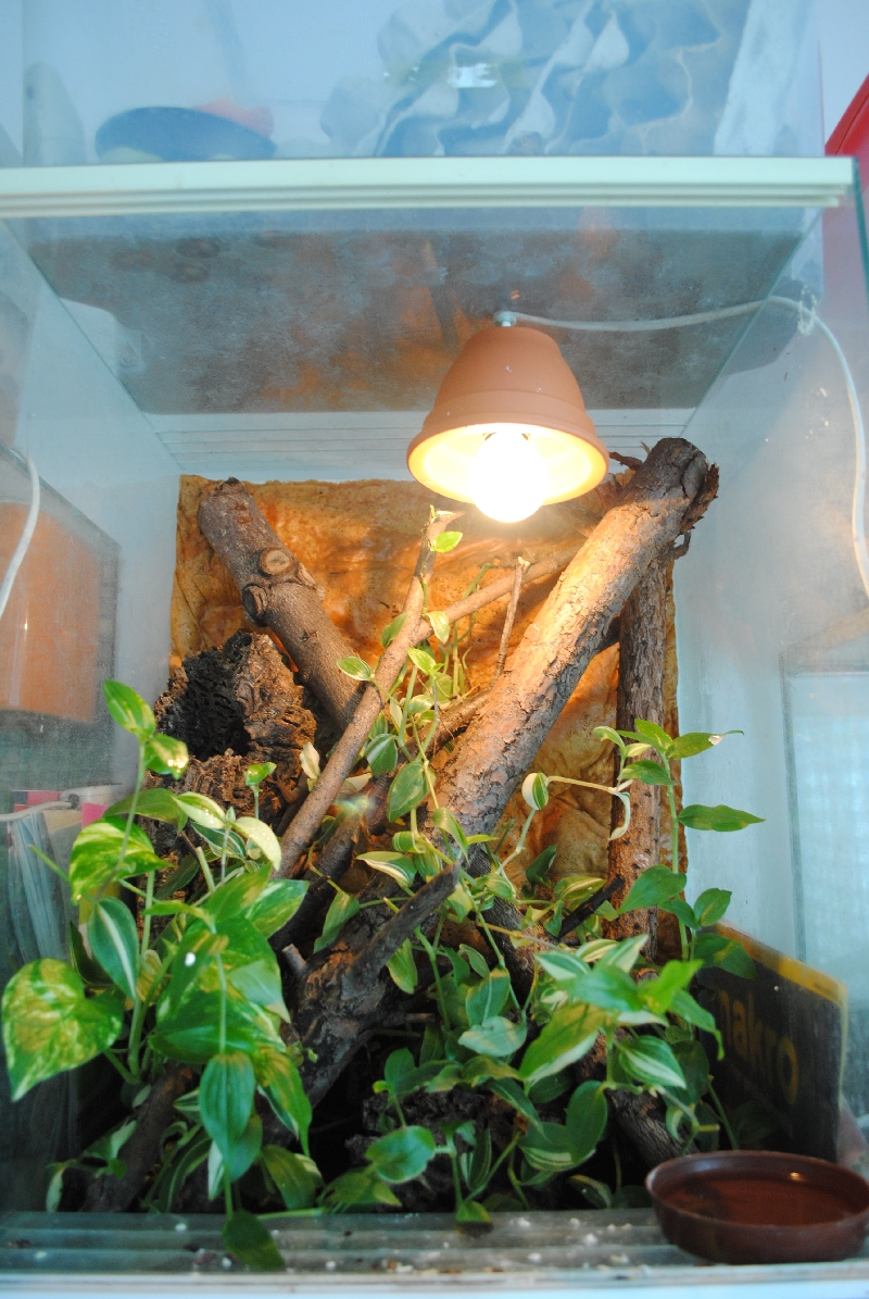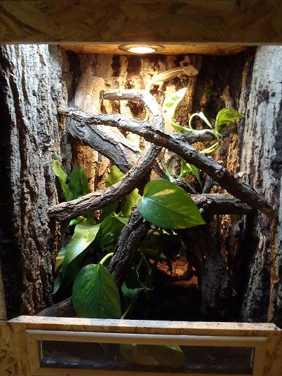 Netřeba nijak zázračně napodobovat přirozené prostředí, do terárka hodně větví(u gekonů se mi osvědčily spíše silnější) nějakou tu odolnější rostlinu aby jí při svých nočních aktivitách moc nepolámali(scindapsus) a nějaký ten úkryt - třeba plát korkové kůry opřený o stěnu nebo cokoliv podobného, já rád používám korkové trubky co koupíš na burze nebo ve zveráči, zvířata je milují.