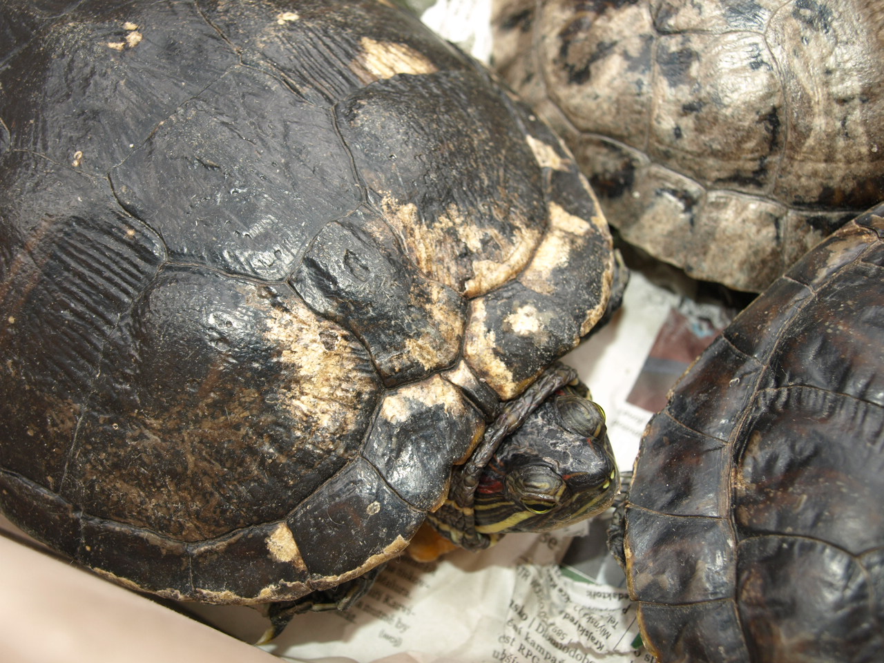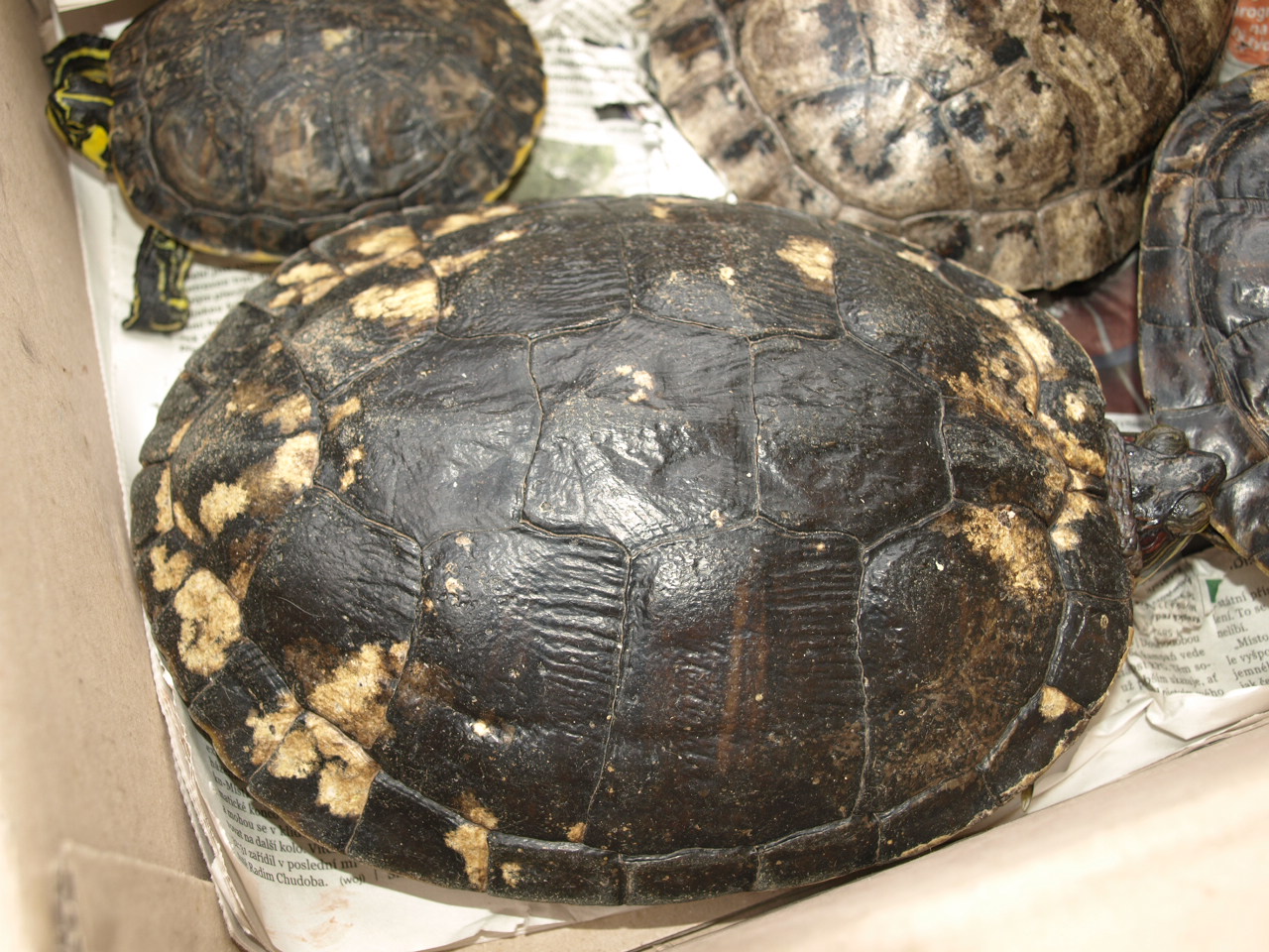 nejsou to mé želvy- vlastně teď už jsou, tak o předchozích chovných podmínkách moc nevím. Ale byly chovány doma v akvateráriu, byly nějakou dobu venku, ale utíkaly. Předchozí majitelé je dali dohromady z různých nalezenců a nechtěných chovanců. Nejdříve s tím přišla jedna želva a pak se to objevilo u ostatních, to by poukazovalo na nějaké infekční onemocnění, každopádně želvy vypadají, že jim to nijak nevadí. Před několika lety to majitelé řešili s vetem a ten nasadil nějaké antimykotikum, ale mají to stále, léčba zdá se nezabrala. Osobně se mi to moc řešit s nějakým vetem nechce- není tu žádný "plazař" a nevím jestli to má smysl.