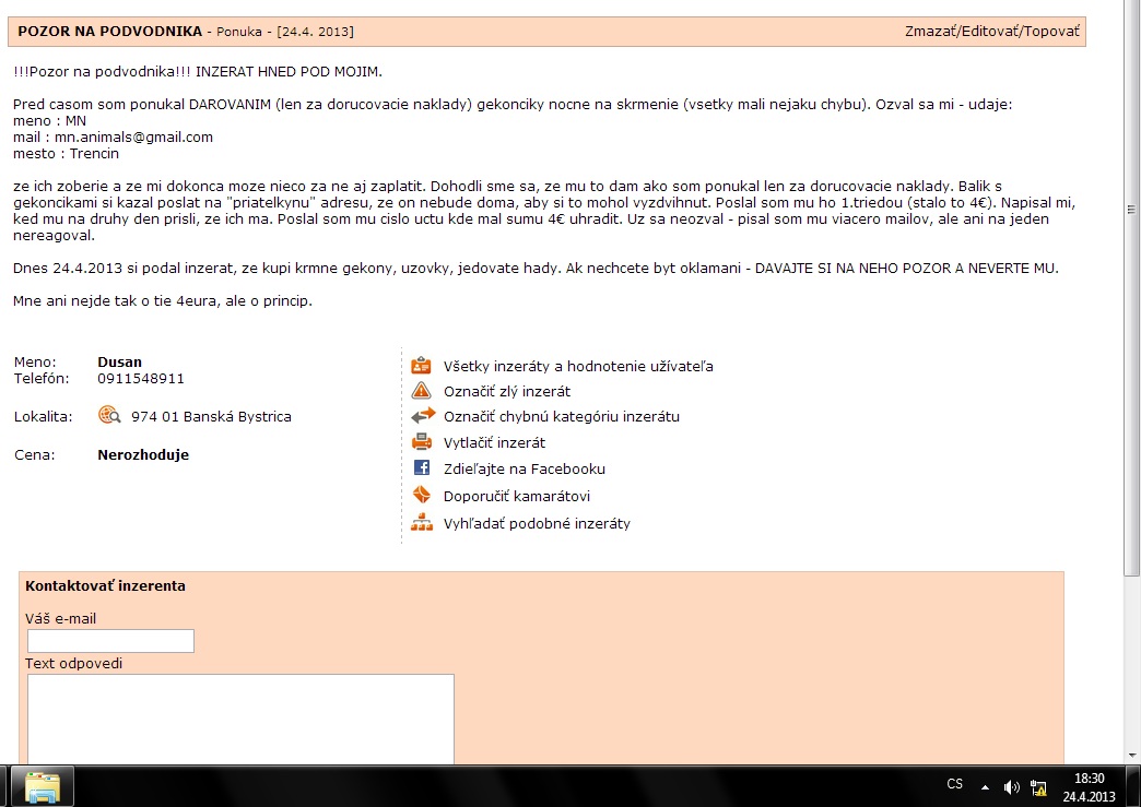 Ale vidim, ze zrejme dotycnemu co podaval inzerat na gekony napisem ja :-) Snad este nieco bude mat.