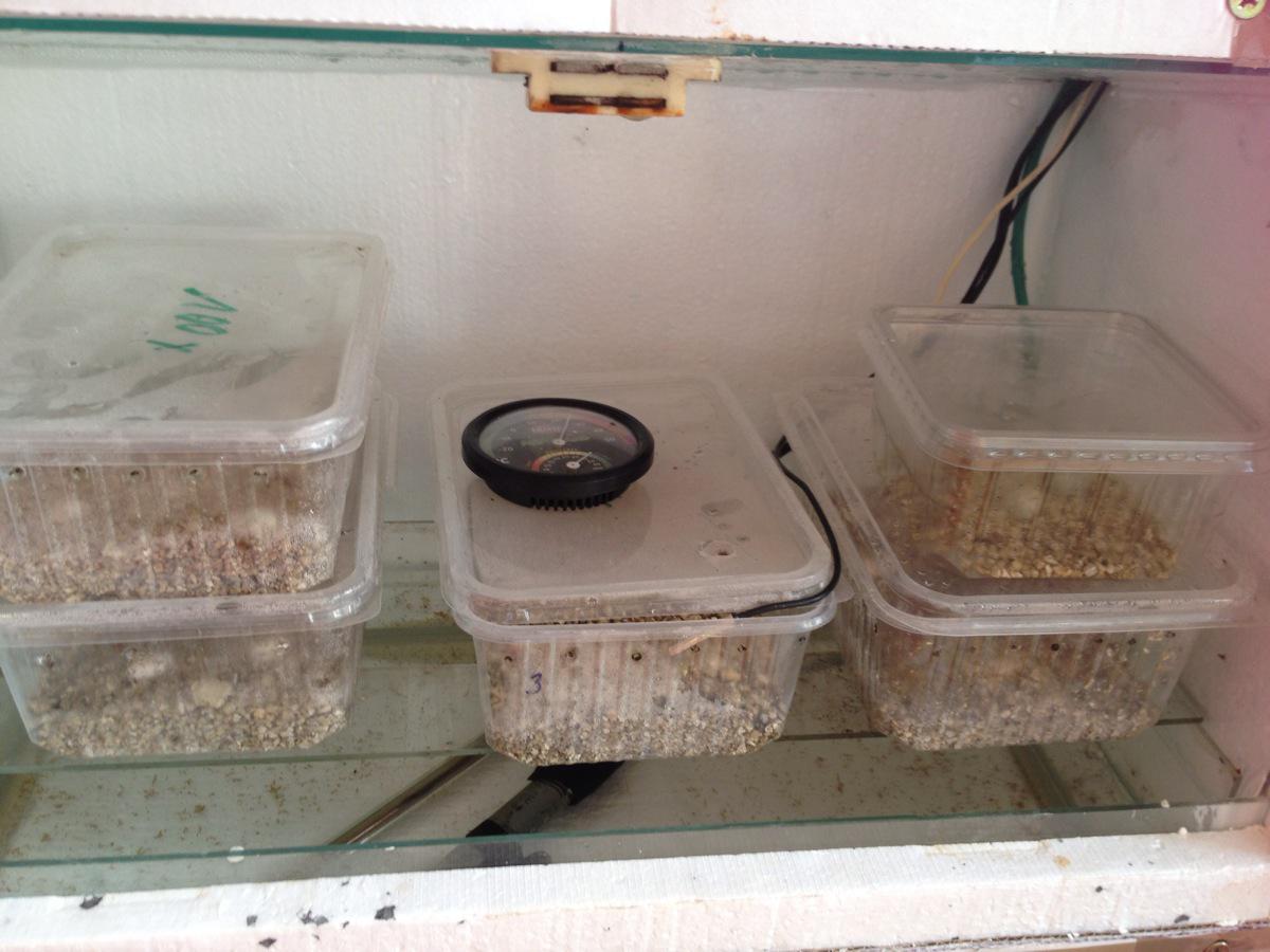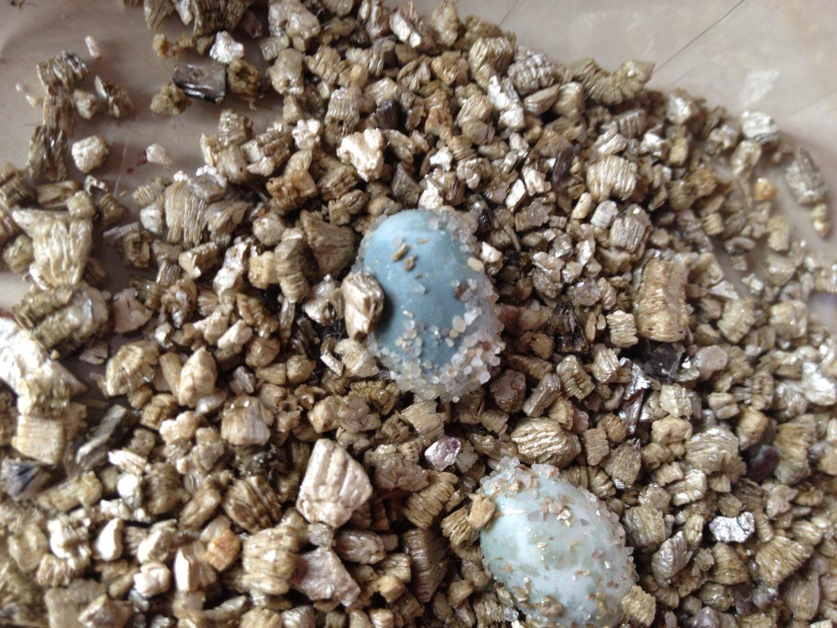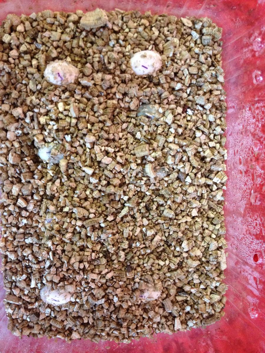 vypada to v pohode. tema dirkama na boku krabicek si vermikulit natahne dost vlhkosti. myslim ze ty zelene budou neoplozene. ono se to vetsinou ukaze do 14 dni. zkus je dat nekam jinam, ale po tydnu uz by se stejne nemelo moc manipulovat s vejci. uvidis. a ostatni jsou v pohode? zvetsily se??