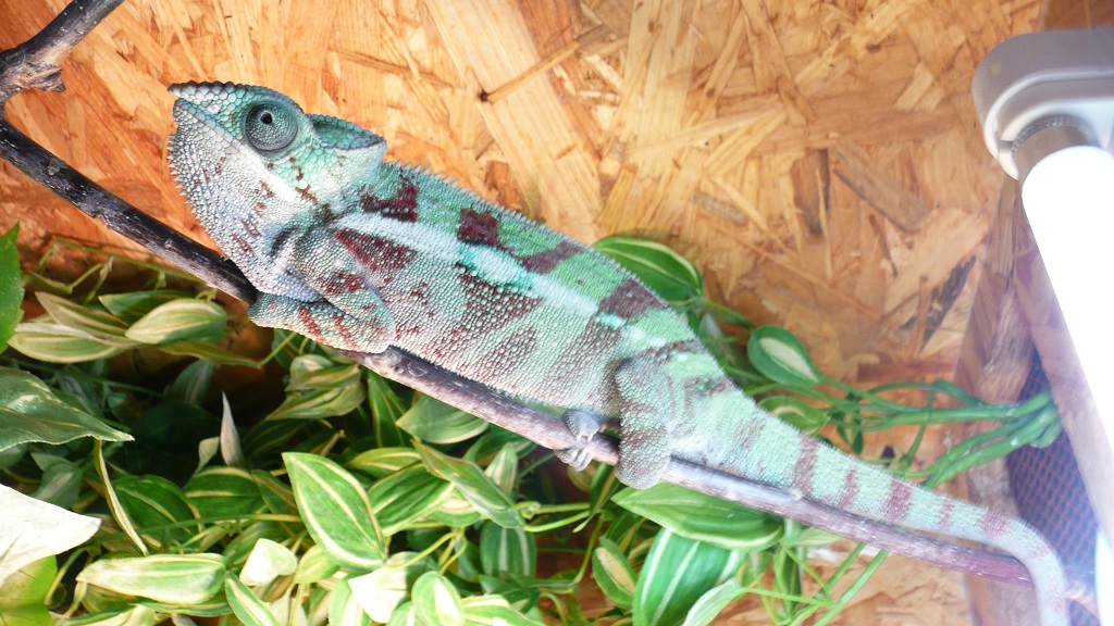 Terárium má 100x50x50, umělé kytky, ibišek, Repti Glo 10.0 (bohužel), výhřevnou bodovku - pod ní je 38°C a ještě lineární zářivku. Každý den mu měním krmítko, kde má cvrčky. Cvrčky obaluji ve směsi vápník+nutrimix+roboran+calciumAD3. Dávám mu tam každý den 4-5 čerstvých cvrčků. Zkoušel jsem vícero velikostí, ale pořád je odmítá. Mám doma ještě šváby a moučnáky - taky bez úspěchu.