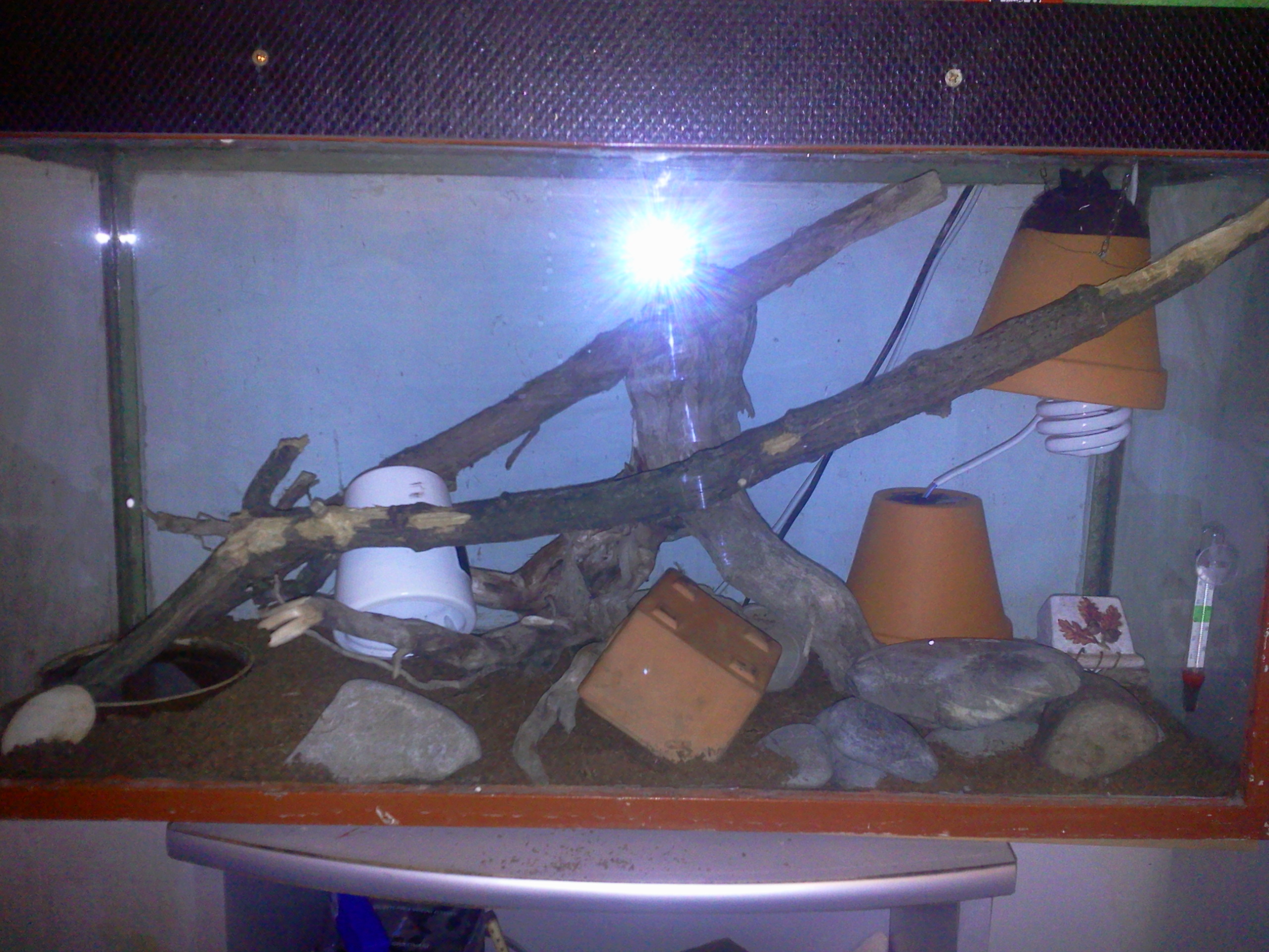 Měla terárium nebo akvárium? To, že někdo něco dělá neznamená, že činí správně. Větrání je potřeba udělat tak, aby cirkuloval vzduch (zase pozor na průvan). Ideálně tak, jak jsem psal. Je spousta jiných variant, jak řešit substrát. Ten lignocel není vůbec potřeba. Umí se to lepit i na kloaku... Tu žárovku v květináči dole hned vedle té druhé. Je to docela opičárna... Až budeš dělat pozadí, předělej to celé řádně na terárium s větráním a se šoupačkami. Nebo pořiď nové. Za pár šlupek dnes koupíš krásná terária.