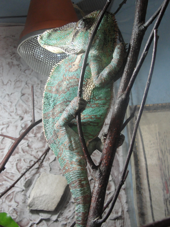 mám asi rok a půl starého chamíka. Je to sameček je vitální normálně zbarvenej, nafouknutej není ani nemá žádné bouličky. Už asi 14 dní mi nechce žrát a má problémy s vylučováním. často zavírá oči, leze po větvích hlavou dolů a občas padá. Stisk má pořád dobrý dávám mu každý den trochu olivového oleje, vlažnou koupel a vitamíny rozpuštěné ve vodě s tim že pije naprosto normálně i možná více než předtím, ale změna je jen nepatrná. Nevíte jak bych mu mohla ještě pomoci...? Specialistu na plazi mám daleko...:( teplota pod výhřevnou žárovkou asi 30°C vlhkost mu udržuju okolo 70% výška terárka je metr a uv taky má... krmení měl obden vždy obalené ve vitamínech Nutri mix Rep calci plus... PS: fotka je dnešní a přilbu si odřel už dávno o mřížku na topné žárovce...