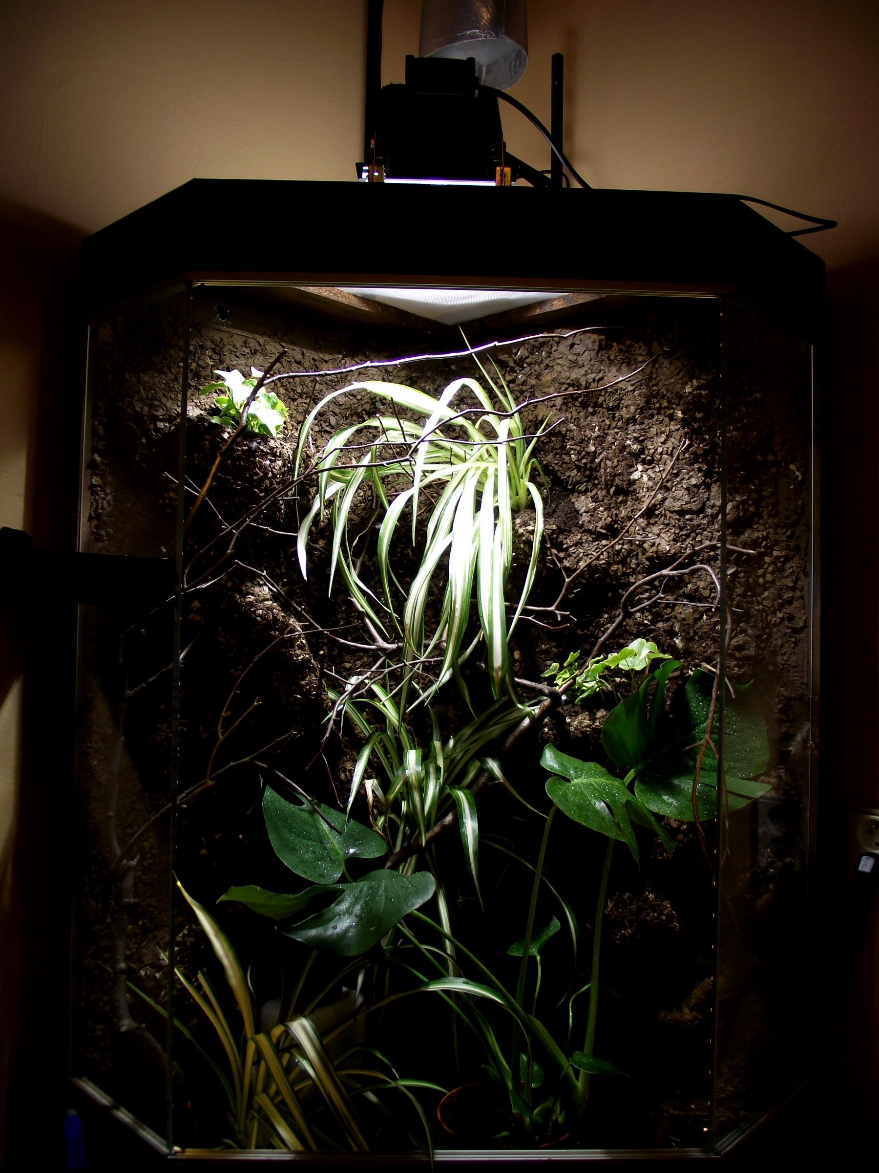 Rozměry jak jsem psal 65*65*120cm (s tím že je rohové, předek je trošku zkosený, vychází to na asi 400l objemu). Větrání je dole přes síť (celkem 5*80cm) a celý strop (asi 55x55). Je to dostatečné? Na osvětlení mám OSRAM HQI-TS 70W, na UVB Osram Vitalux (počítám s použitím tak 1 - 2h denně), pro výhřev klasická žárovka (reflektorová) 40W. Pod žárovkou 34C (na vzdálenost asi 15cm od ní - nedošáhne na ni zatím), dole u dna 22C, vlhkost se pohybuje s rostlinama kolem 45-55%.