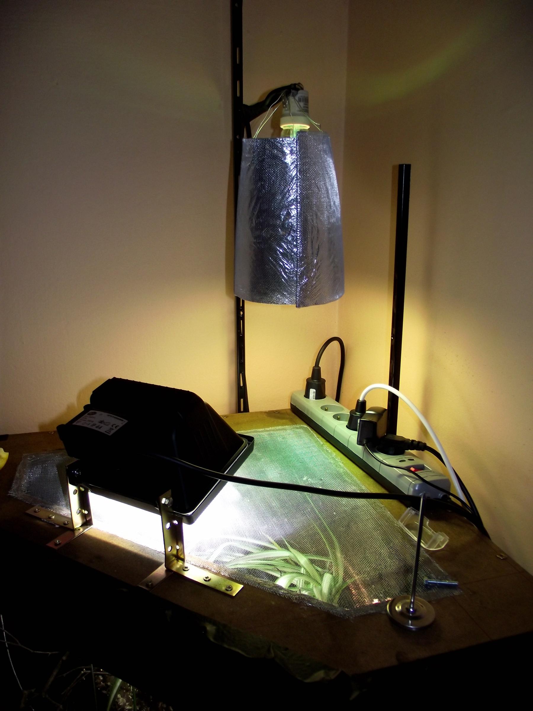 Posílám ještě fotku stropu terárka s lampami a krmícího & ohřívácího místa. Zapnul jsem mu zase Vitaluxku a reakce jako včera, chamík zčernal a šel se opalovat asi na 5 minut, pak si zalezl pod rostlinu do polostínu.