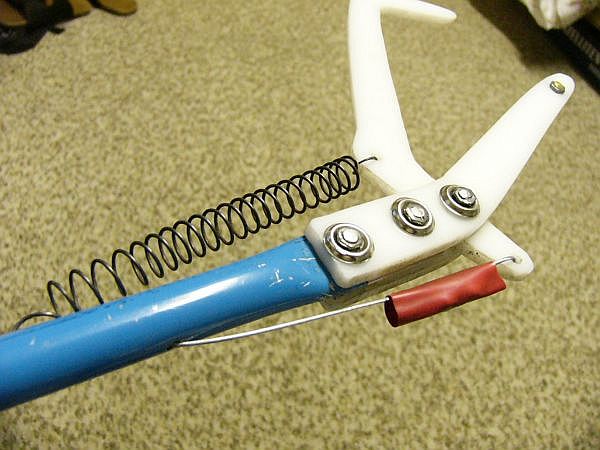 Taky vlastní výroba. Není to nic složitého, rukojeť ze staré plechové pistole na silikon, stará lyžařská duralová hůlka, kus silonu na čelisti, lanko a péro. Proti originálním (mimochodem, pěkně předraženým) kleštím, je cena docela směšná... nejdražší bylo asi to lanko