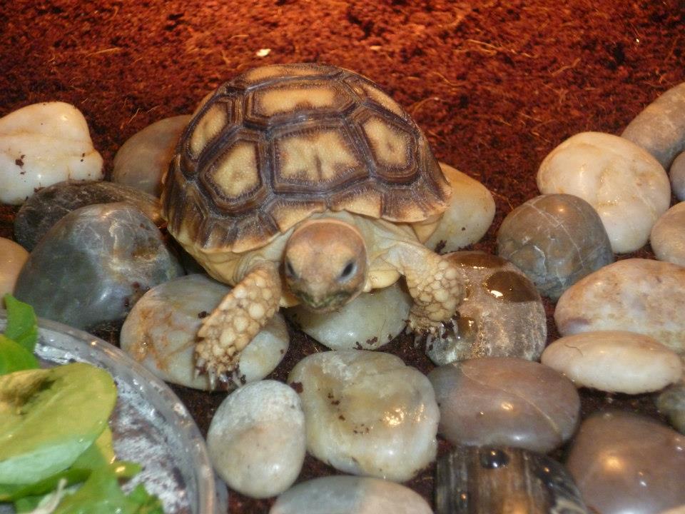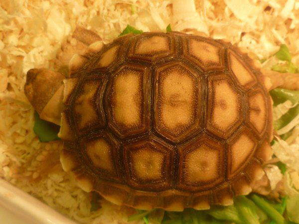Pokud je zvíře v pohodě, tak jsou to neskutečně "tvrdá" zvířata a hlavní chyba chovatelů je, že je příliš rozmazlují. Tato želva má být pouze na travní směsi či na seně. Jinak okamžitě pyramiduje. Sama mám želvu z plzeňské zoo, která měla sklon k pyramidám a "strádáním" a pobytem ve výběhu se nám to povedlo minimalizovat a přírůstky jsou skoro rovné. Píšete, že želva pospává. Želvy hlavně spí skoro celý den. Je to jejich přirozeností,protože aktivita v horkém počasí nepřichází v úvahu. Želva se v tuto dobu zahrabe, aby nepřišla o vlhkost. V přírodě misku s vodou nenajde a je vybavena jinak.. Proto správně píšete, že pro ni máte k dispozici vlhčené hobliny. Želva se přes den po většinu času zahrabe a načerpá vlhkost celým tělem. Štítky se zvlhčí a kost pod nimi roste rovně, ale to jen pokud krmíte balastní stravou (seno). Růst nesmí být prostě příliš rychlý. Musíte želvu brzdit právě těmi téměř "pouštními" podmínkami, kdy je možnost se zahrabat do vlhka a v přechodné době sezobnout cosi suchého. Sulkáty žijí v opravdu suchých oblastech a hrabou neuvěřitelné zákopy. Ve výběhu tedy dost slunce a ať se nedostanou na spodní vodu..
