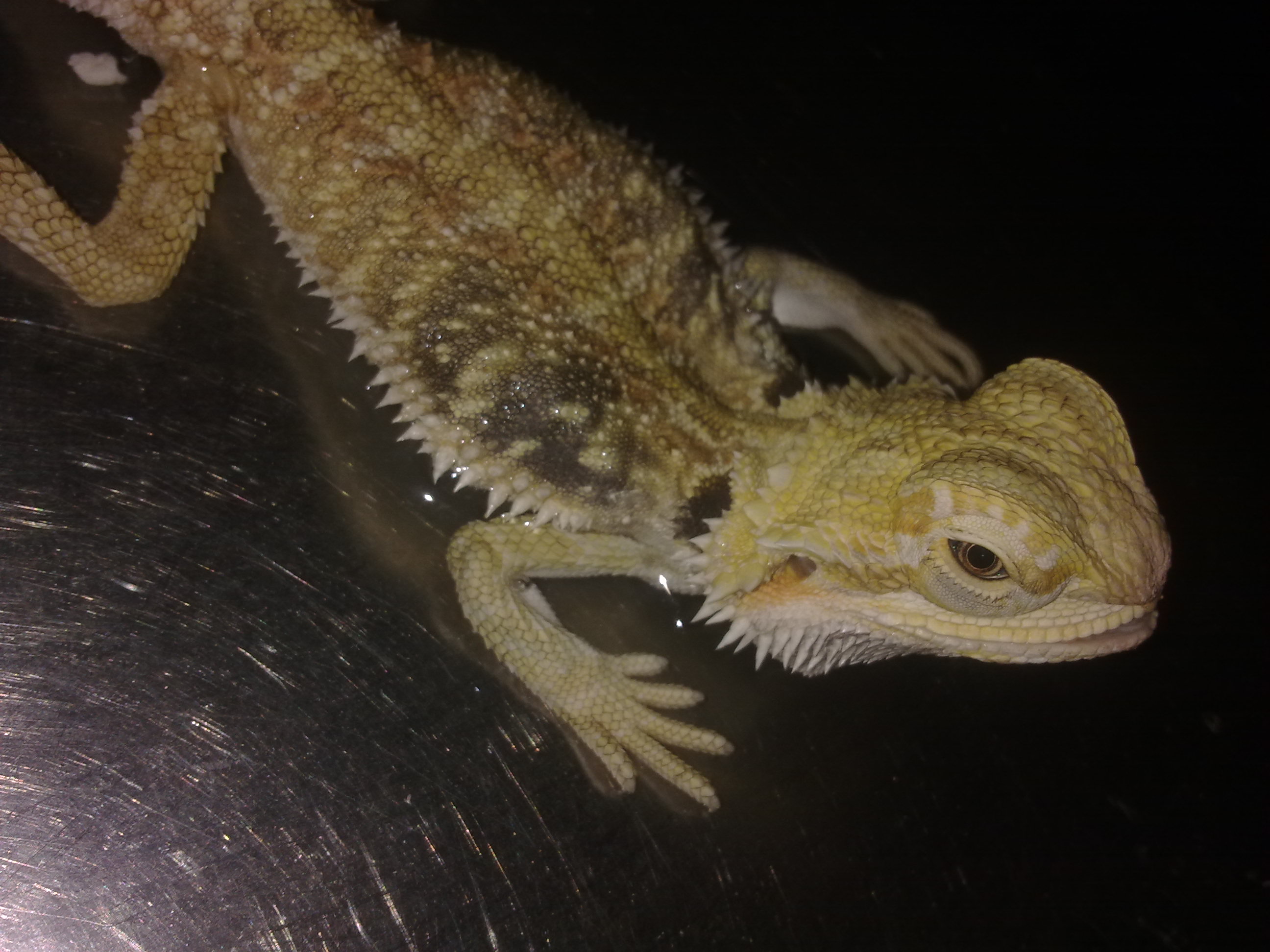 Tak reptiglo máme..dostává obalené cvrčky v roboranu, ale težko je přijmá, podle me má nateklej jazy… nový
