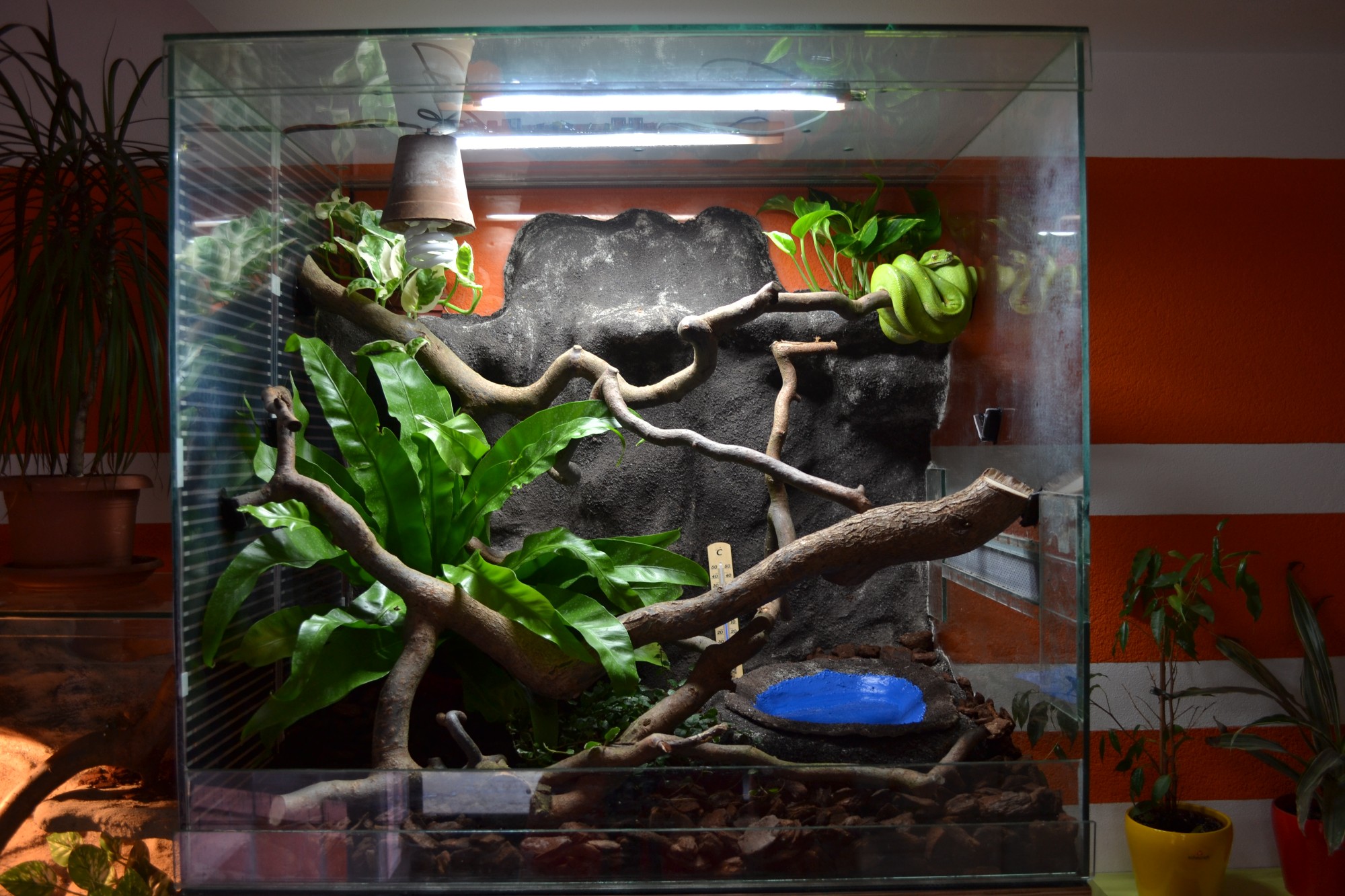 Mám fólii pro M. viridis nalepenou z venku terária na boční stěně a překrytou termofólií za radiátor kvůli nasměrování tepla a naprostá spokojenost z mé i hadové strany. Teplotní gradient zachován mezi 27-32 a v noci pokles o 2°C..Vlhkost mi "udržují" živé rostliny. Jsou to fólie 2x39W..