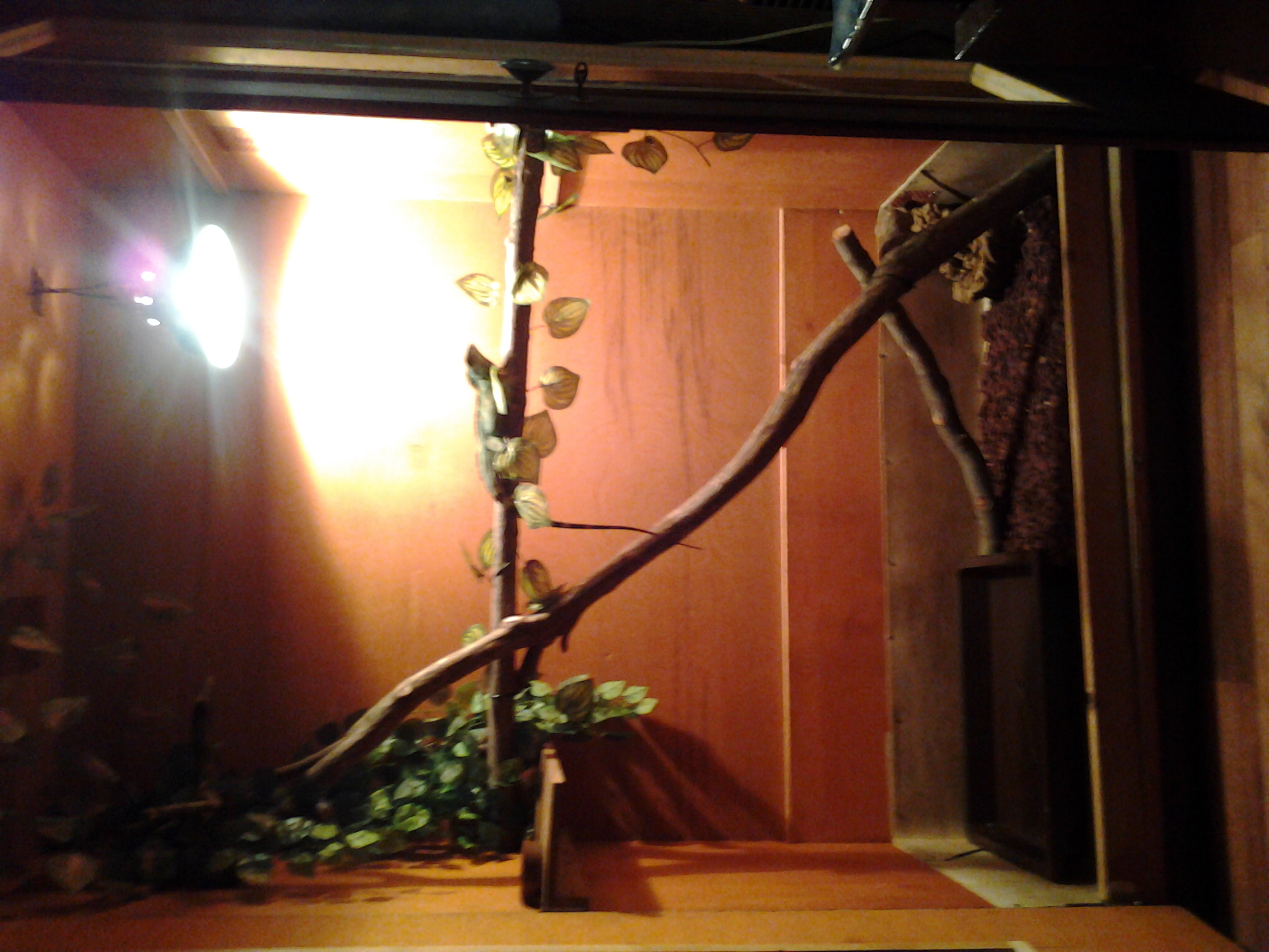 K terárku. Prvně tam musí mít pozadí, nejlépe třeba polystyren pokrytý lepidlem na dlaždičky, do toho lze přidat klasické primalexové tónovačky, udělat z polystyrenu police, a opravdu hodně větví, aby mohl využívat celý prostor terária. Důležitá věc je hodně rostlin a velký bazén, klidně 3/4dna hloubka může být do 30cm - díky tomu se bude udržovat vlhkost. A pak samozřejmě výhřevná žárovka, UV zdroj a nejlíp trubice na dosvětlení. A pořádný větrání, 1/3stropu a pás buď na boku nebo zpředu, aby se vzduch hýbal.... podívej se na akvarko.cz, je tam inspirace až až, pro představu tohle je moje.. terarium.php
