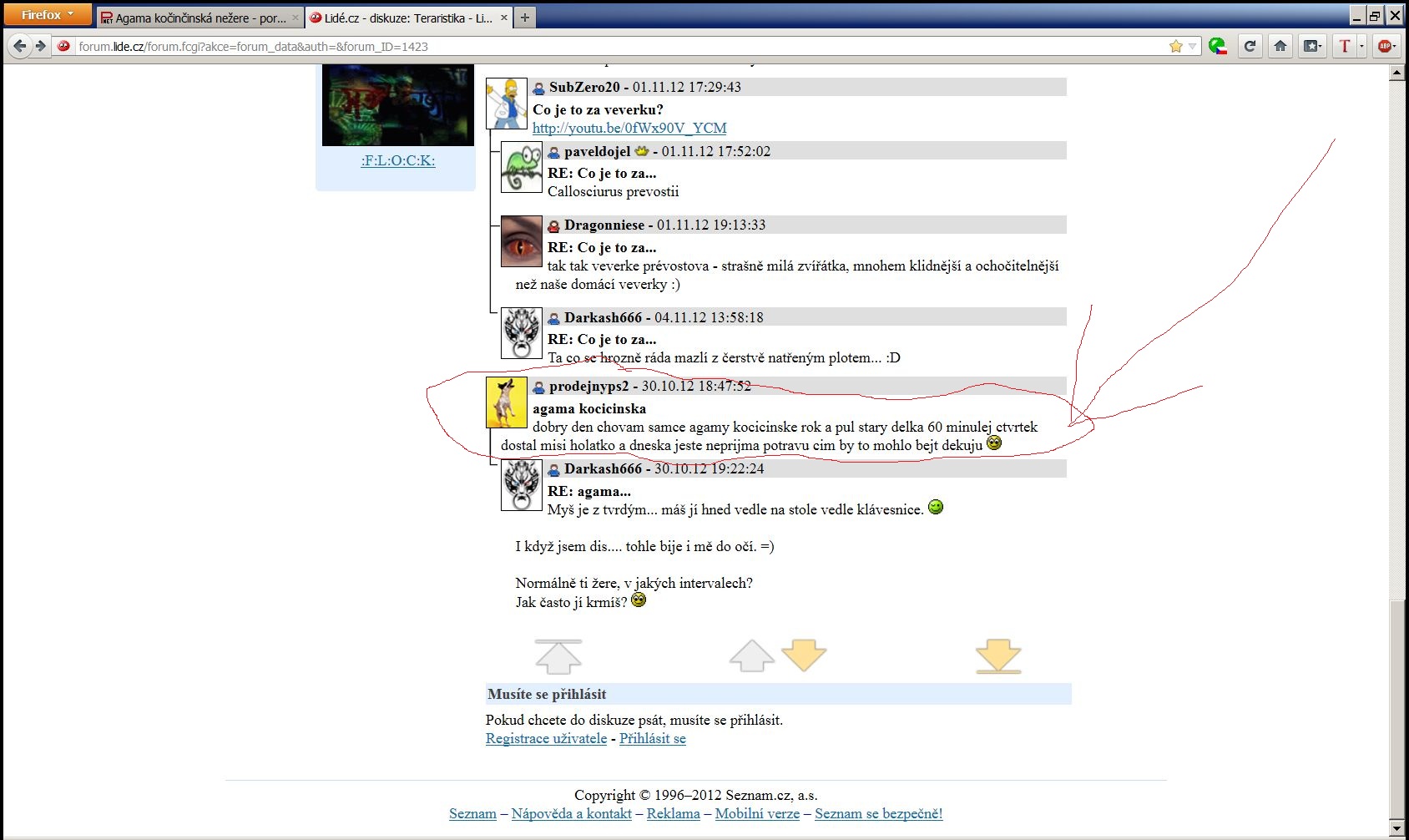 Ze mu to zerete,fotky ty agamy nekde stah a dal se bavi,nikdo ani ten nejvetsi negramot nemuze prece napsat,ze zvireti nevybavi terarko za to,ze jsem ho nazval teletem.Ted vidim,ze jsem se splet slecna neni tele,je to kr*va nejvetsiho razeni.Zamknete to tady,kaslete na jeji potrebu si delat z nekoho prdel.Pokud by ta agama skutecne zila v tech podminkach jak pise,ruku na srdce fakt by takto vypadala po 3 mesicich jako na fotce asi tezko a to nejsem zadny zkuseny chovatel.Tak ji to nezerme a podme se venovat lidem co to skutecne potrebuji a ne kdejake kr*ve co si z nas dela prdel.